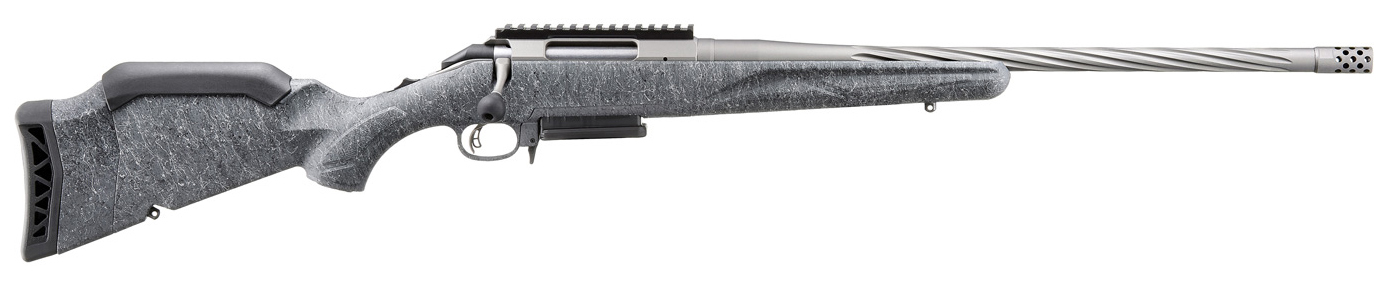 Caliber: 243 Win – Stock Gray Splatter Gen II American – Barrel Fluting Spiral – Barrel Length 20 – Barrel Finish Gun Metal Gray Cerakote – Thread Pattern 5/8-24 – Capacity 3 – Magazine Type AI-Style – Sights None-Picatinny Scope Base – Material Alloy Steel – Weight 6.3 lb. – Twist 1:9 RH – Overall Length 41.25 – Length of Pull 12-13.75 – Grooves 5 – Splatter finished stock provides excellent grip without being too sharp or abrasive. – Soft rubber recoil pad features a large radius on the heel for easy shouldering and improved geometry that progressively collapses to reduce felt recoil. – Removing the installed spacer allows for length of pull to be adjusted from 13.75 to 12. Additional spacers of varying sizes for a more refined fit are available – Installed low comb improves sight alignment when using magnified optics but can be removed when utilizing low-mounted sights. – Professionally applied Cerakote coating on barrel muzzle brake receiver and bolt handle results in a durable easy-to-maintain finish. – Medium contour barrel features deep spiral flutes that reduce weight at the muzzle end of the barrel to improve balance without sacrificing stiffness or accuracy. – Threaded barrel with factory-installed radial port muzzle brake is cold hammer-forged resulting in ultra-precise rifling that provides exceptional accuracy and longevity. – Intuitive three-position tang safety locks the bolt preventing inadvertent bolt opening while allowing the rifle to be loaded with the safety engaged. – Ruger Marksman Adjustable trigger offers a crisp release with a pull weight that is user-adjustable between 3 and 5 pounds. – Patented Power Bedding integral bedding block system positively locates the receiver and free-floats the barrel for outstanding accuracy. – The one-piece bolt is CNC machined from stainless steel for smooth operation and the familiar three-lug design with 70° throw provides ample scope clearance. – Oversized bolt handle for positive bolt manipulation with a 5/16-24 thread pattern for easy replacement. – Factory-installed one-piece Picatinny scope base. – Available accessory stock weight kit adds up to 1.6 pounds to the butt of the rifle to absorb recoil and improve the rifle’s balance when utilizing heavier muzzle devices. – Also includes: one magazine; steel sling swivel studs.