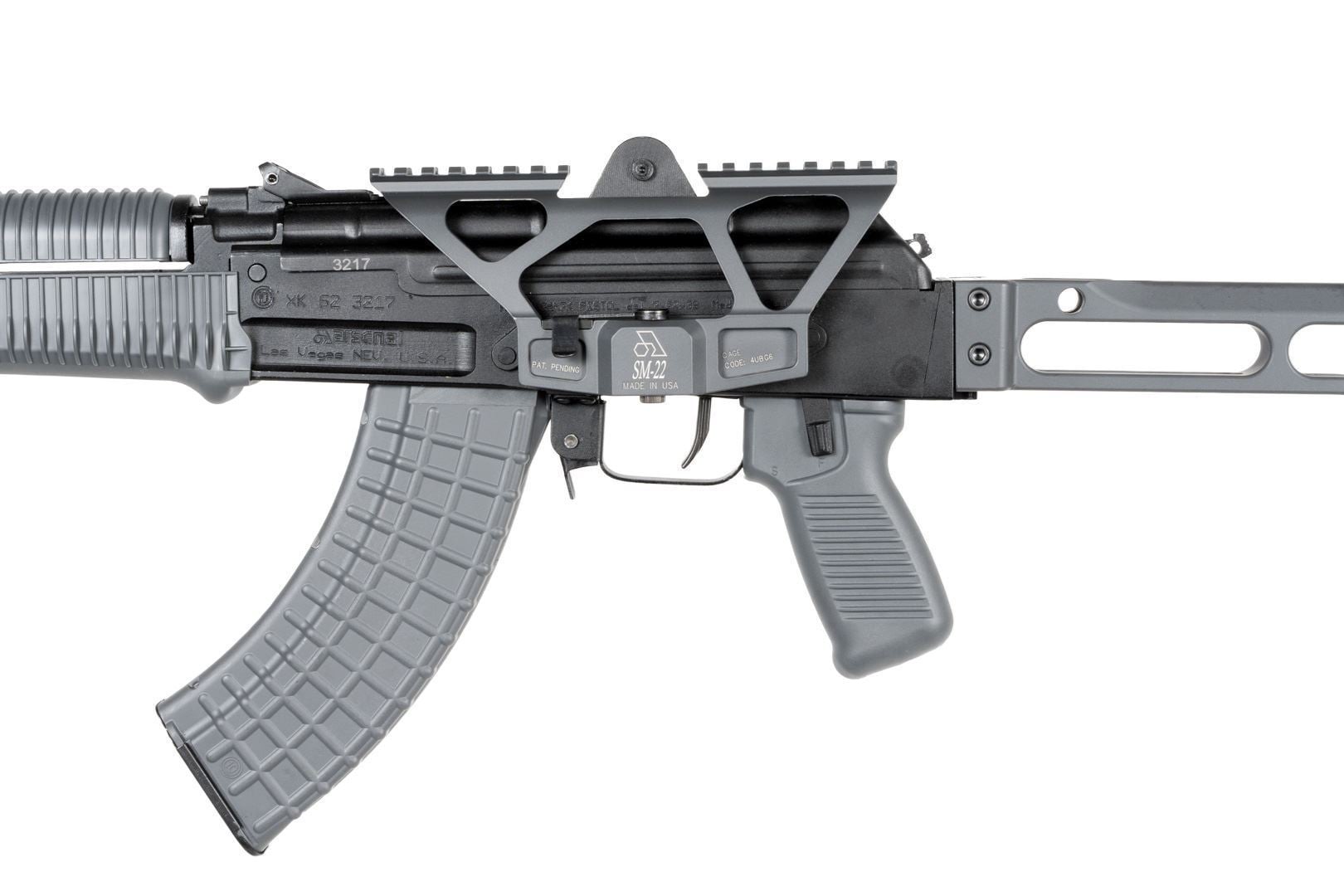 The SM-22G Gray Cerakoted scope mount is a lightweight aluminum side scope mount that works with Arsenal Milled SBR’s all SAM7K pistols the SAM7SFK and AR-M4SF as well as any model Arsenal with the rear peep sight centered on the dust cover. This model will also work on VEPR folding stock rifles that have interference issues with standard SM-13 scope mounts. These have 2.9 inches of Picatinny rail per section for a total of 5.8 inches of usable rail space. These are a low profile one-piece quick-release design with 7 picatinny slots forward of the rear sight and 7 picatinny slots behind the rear sight and are manufactured by Arsenal Inc. USA.