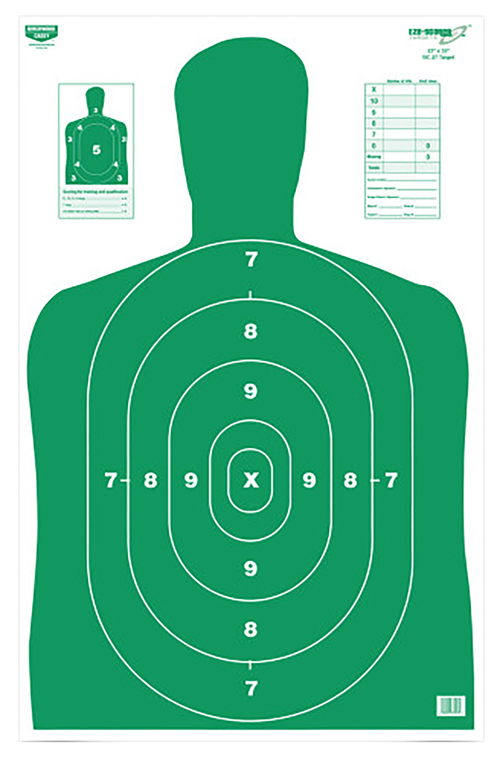 Great for indoor and outdoor ranges. This target features a high contrast green silhouette, scoring table for recording hits and values, and a score card that is printed on target. It has dimensions of 23″ x 35″.