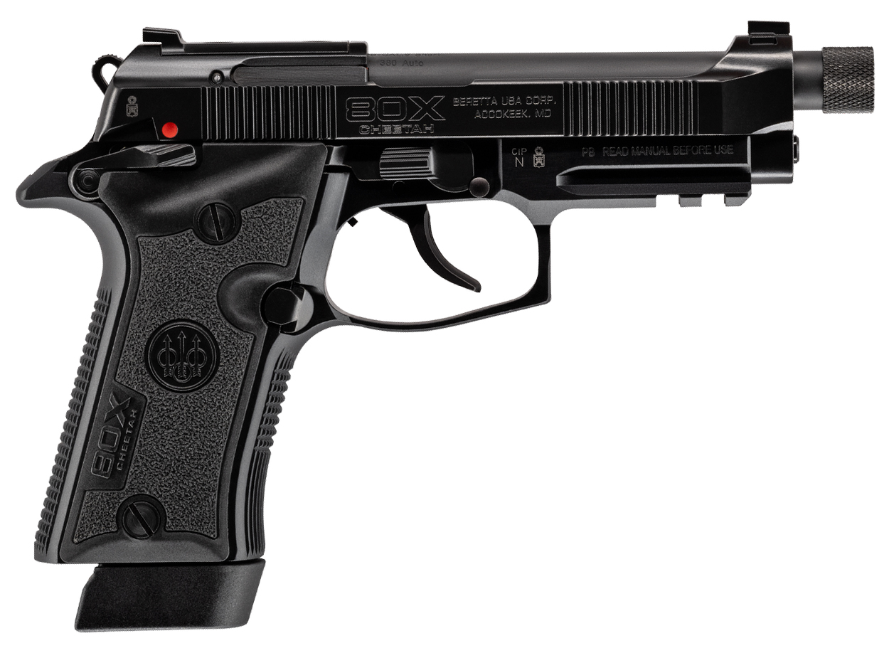 THE 80X CHEETAH TACTICAL reimagines the legendary platform with a new sleek design and enhanced features including a threaded barrel for optimal performance. Built for modern-day concealed carry this iteration retains the revered Vertecstyle grip profile the X-treme S Double/Single trigger and a skeletonized hammer while introducing enhancements tailored with a suppressor option. With a ½ x 28 threaded black barrel this pistol delivers unparalleled control and precision ensuring rapid follow-up shots even under duress. Equipped with three white dot sights offering a reliable aiming solution that enhances both visibility and accuracy. The black polymer grip panels ensure a secure hold maintaining control during extended engagements. – The 80x Cheetah Tactical comes with 2 extended magazines offering a 15-round capacity to handle any threat with confidence and efficiency. Beretta understands the importance of comfort and usability in defensive firearms and the 80x Cheetah Tactical delivers with an easier-to-rack slide and meticulously tuned recoil management. Available in a tactical urban finish the 80x Cheetah Tactical blends style with functionality embodying Beretta’s commitment to excellence and style in EVERY detail. – THREADED BARREL – Comes suppressor-ready out of the box with a ½-28 threaded barrel for greater precision and more accurate followup shots due to reduced recoil. – ADJUSTABLE X-TREME S TRIGGER W/ SKELETONIZED HAMMER – A light crisp and consistent single-action/double-action pull. The overtravel is adjustable to shorten the reset to 1mm. – OPTIC-READY SLIDE W/ INTERCHANGEABLE SIGHTS – Comes optics-ready allowing for the ability to add an optic to improve accuracy and target acquisition speed. – VERTEC GRIP W/ FRAME MOUNTED SAFETY & PICATINNY RAIL – Allows for a more compact profile for carrying concealed. The added feature of a Picatinny rail gives the option for weapon-mounted lights and other Picatinny-mounted accessories. – (2) 15-ROUND EXTENDED MAGAZINES – 15-round capacity compact size and optimized ergonomics for concealed carry. – 80X Cheetah Tactical Urban – Model 80X Cheetah Tactical Urban – Grip Width 1.06 – Overall Length 7.3 – Sight Radius 133 mm – Family 80 Series – Activity Defense – Caliber .380 – Barrel Length 4.4 – Overall Height 4.9 – Overall Width 1.4 – Weight Unloaded 25 oz – Frame Size Micro Compact – Magazine Capacity 15 Rounds
