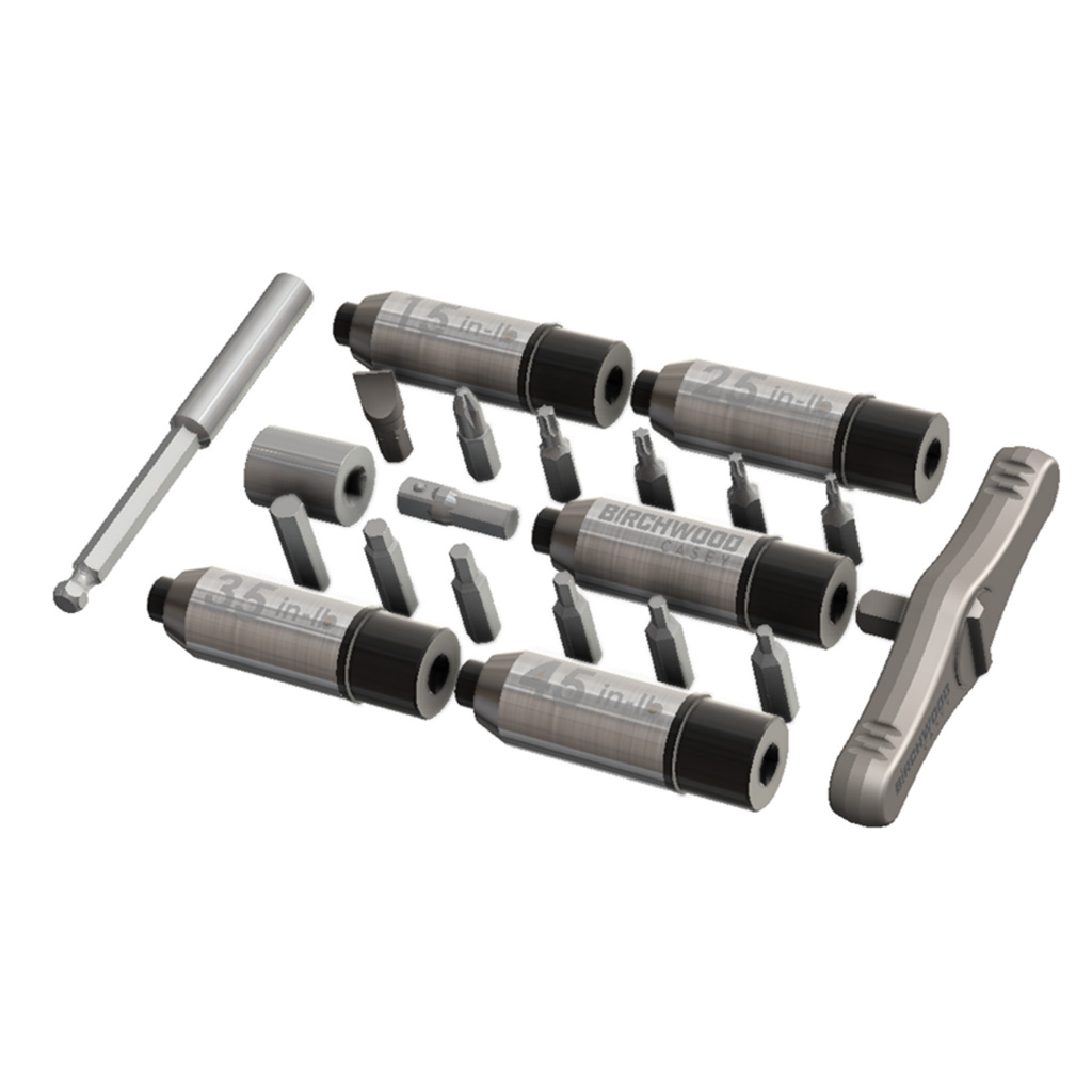 The Birchwood Casey Torque Limiter Set is a 17-piece toolkit designed for precise firearm adjustments and repairs. It includes a ratcheting T-handle driver, five preset torque limiters, a selection of 12 bits for various tasks, a hex extension bar, and a 1/4″ drive socket adapter, all housed in a convenient zipper case for portability.