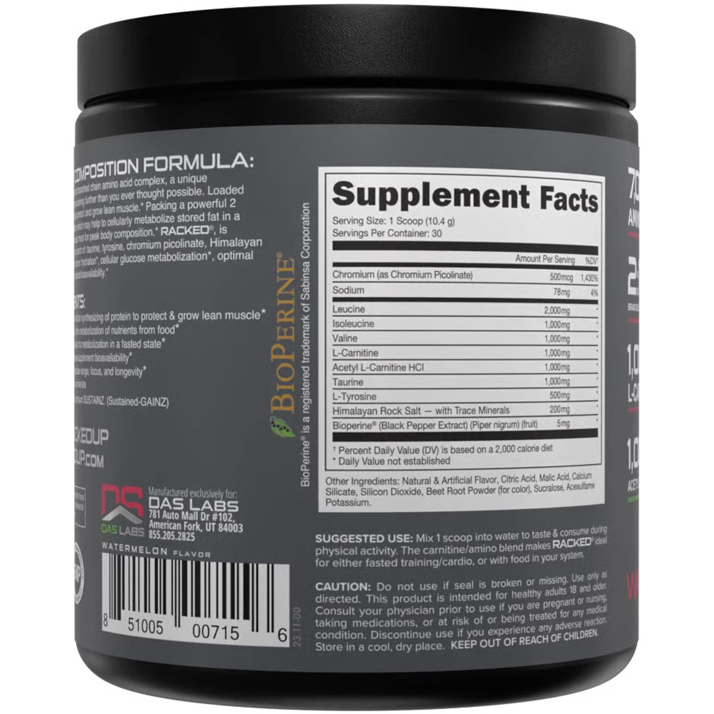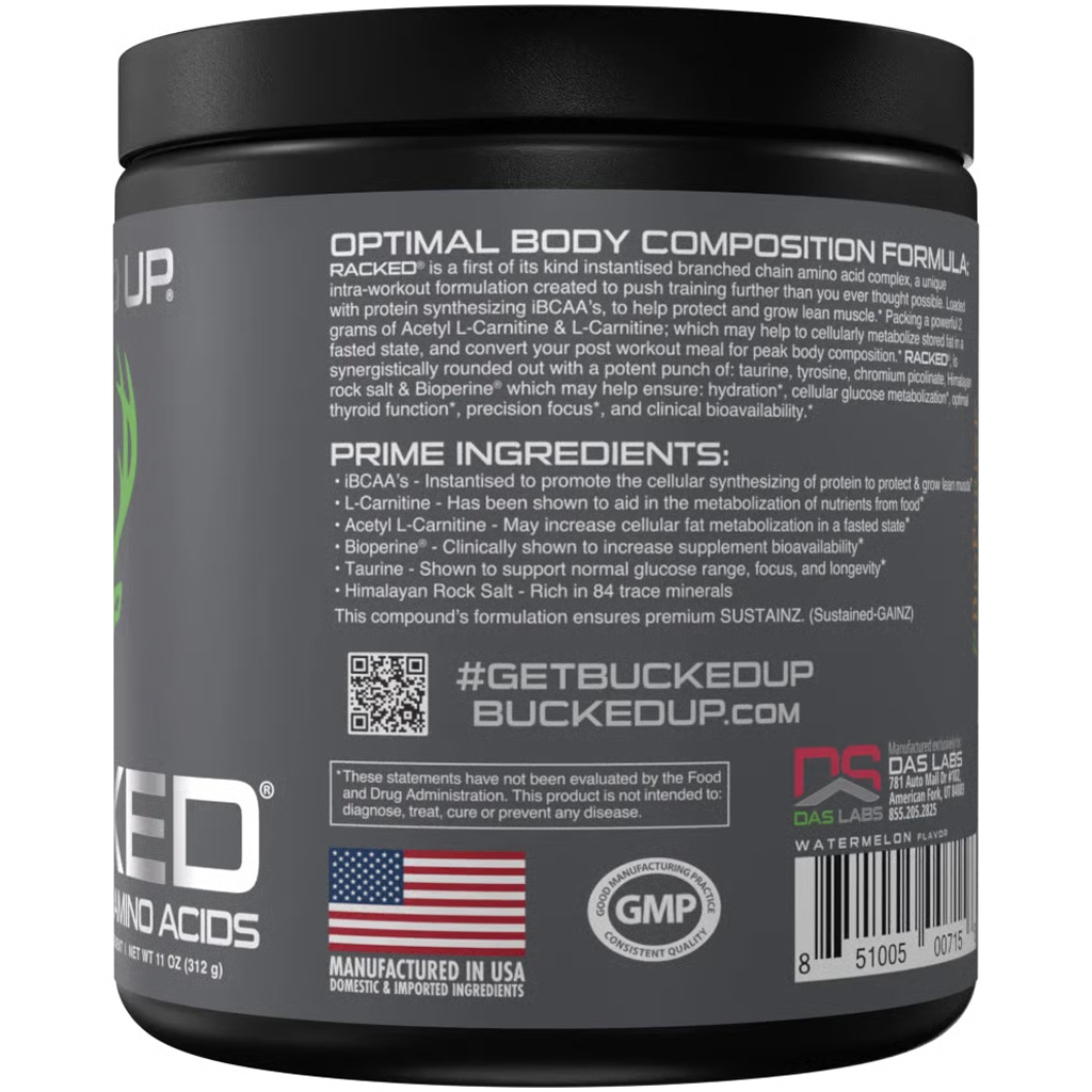 Bucked Up Racked BCAA is a high-performance branched chain amino acid complex designed to enhance muscle growth, recovery, and fat metabolism. Featuring a scientifically supported 2:1:1 ratio of instantized BCAAs, Racked delivers rapid amino support exactly when your muscles need it. This formula is further amplified with clinical doses of L-Carnitine, Acetyl L-Carnitine, and GBB to boost fat oxidation, promote energy, and intensify thermogenic effects—making it a potent fat-burning tool. Additional ingredients like Himalayan sea salt, taurine, tyrosine, and chromium picolinate support hydration, performance, and cellular energy optimization. With 30 delicious servings per tub, Racked BCAA is a powerhouse for athletes aiming to maximize every workout.