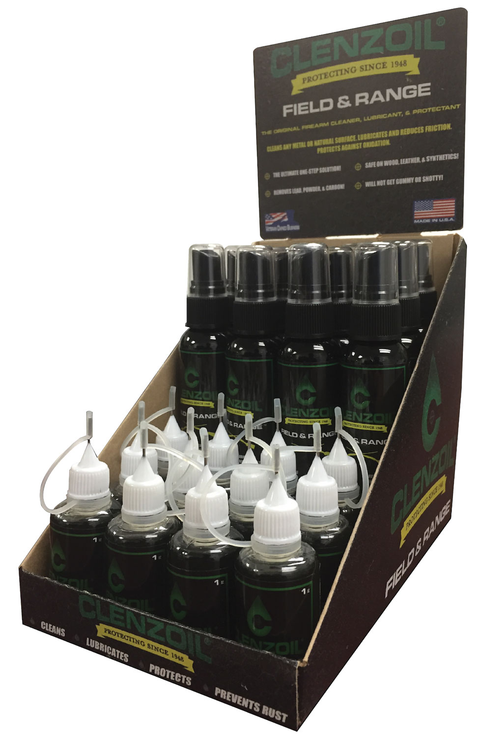 Clenzoil Field & Range is a high quality one-step cleaner, lubricant and rust preventative for Lock, Stock and Barrel. It is effective in removing oils, dirt, copper, lead and other contaminants. It provides a thin, non-greasy coating that prevents rust and lubricates all moving parts of firearms and sporting equipment. Clenzoil also nourishes, preserves and protects wood and leather. It will not harm polymers or other synthetic surfaces. Clenzoil is great for wood stocks and grips, as well as leather holsters, scabbards and slings. *Not recommended for painted surfaces. This display comes with 12 2oz Field & Range pump sprayers and 12 1oz Field & Range needle oilers.