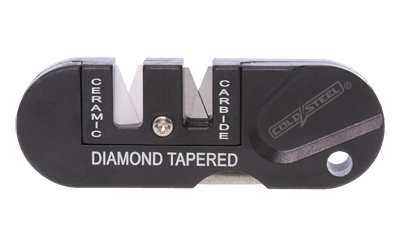 The Cold Steel 3-in-1 Knife Sharpener has two pre-angled sharpening stones. One of the stones is ceramic and the other is carbide. The carbide edge can provide you with a quick sharp edge, and the ceramic sharpener can give you a finer, razor sharp edge. Additionally, there is a fold out, diamond coated tapered rod for sharpening serrations or small gut hooks.