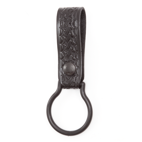 This ring style flashlight holder from Gould & Goodrich holds D cell flashlights. The leather belt loop fits standard duty belts up to 2.25 wide and has a Plain finish. The black ring has a cutout for the flashlight switch. Gould & Goodrich uses only top quality materials right down to the threads and glues in the production of police duty gear and holsters.