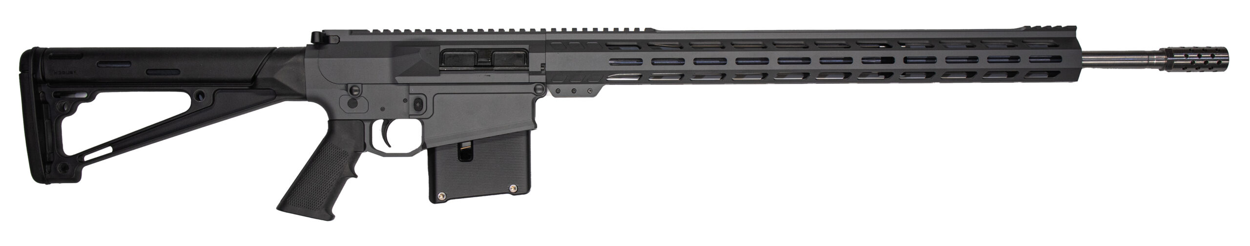 Barrel: 24 superior quality stainless steel (416R) with 5R rifling – Muzzle Brake: 5/8 x 24 stainless steel (416R) – Rifling: 1:8 Twist – Lower: Aluminum billet (7075) – Upper: Aluminum billet – Handguard: 20 Aluminum M-Lok upper picatinny rail – Gas Block: .750 4150 Steel Black Oxide Coated – Gas System: Rifle – Stock: Hogue fixed rifle stock black – Grip: Standard – BCG (Bolt Carrier Group): Custom design – Charging Handle: Custom design – AR-10 Compatible parts: Lower parts kits trigger safety – Magazine: GLFA custom aluminum 5 round black – Magazine has open witness window and tabs to pull down for easy loading