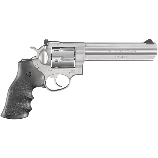 Action: DA/SA – Caliber: .357 Mag – Capacity: 6rd – Barrel: 6 Stainless Steel Satin – Frame: Stainless Steel Satin – Cylinder: Stainless Steel Satin – Grip: Hogue Monogrip Black – Sights: Adjustable Rear Ramp Front – Length: 11.5 – Weight: 45 oz – Triple-locking cylinder is locked into the frame at the front rear and bottom for more positive alignment and dependable operation shot after shot – Patented grip frame design easily accommodates a wide variety of custom grips – Takedown of integrated subassemblies requires no special tools and allows for easy maintenance and assembly – Patented transfer bar mechanism provides an unparalleled measure of security against accidental discharge – Also Includes: hard plastic case – Strength Simplicity and Ruggedness. Ruger® GP100® double-action revolvers are among the most comfortable shooting revolvers. Their rugged medium-sized frame and grip system permit repeated firings with minimal shooter fatigue. – Easy on the hand and budget all GP100 revolvers boast solid steel sidewalls (no side-plates) and frame widths that are increased with extra steel in critical areas that support the barrel making them rugged reliable and dependable.