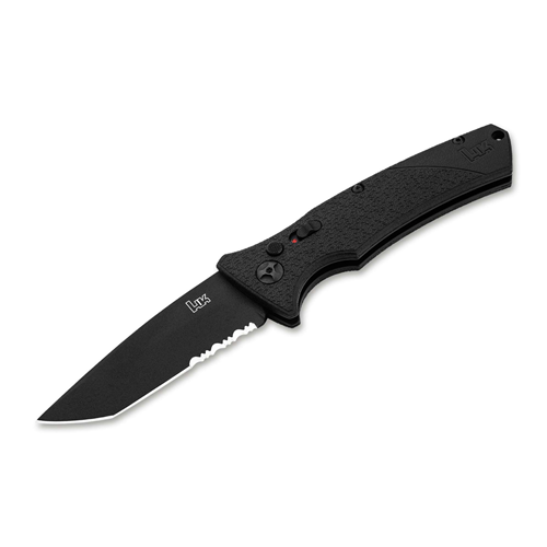 The Heckler & Koch automatic knives FD01 & FD02 are tactical no-nonsense function folders of the purest calibre. The reliable mechanisms with a side blade opening, coil spring and button lock have proven themselves hundreds of thousands of times over in the Kalashnikov and Boker Plus series of switchblade knives for more than a decade. The lock is equipped with an additional side-mounted slide-lock for safe handling. The D2 steel blades are black coated. The handle is made of steel liners and fibre-reinforced nylon (FRN). The nylon has the characteristic moon and knob texture of the handles of Heckler & Koch military and government handguns. The knives are equipped with a pocket and belt clip for tip-up (r) carry and are available in two versions with different blade shapes. The Heckler & Koch FD01 is the fully tactical version of the tactical switchblade knife with a robust tanto blade and half serrated edge (combo edge) for cutting fibrous materials such as webbing and rope.