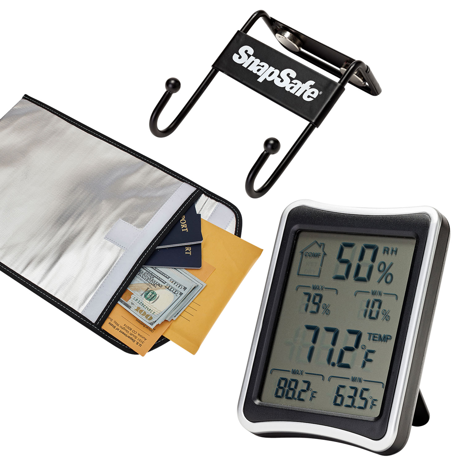 Get the most out of your safe by maximizing space and increasing functionality. The Safe Accessory Pack includes all our most popular accessories in one package. Magnetic hook, document basket and document bag keep your valuables safe and organized while the dehumidifier, LED light strip and hygrometer ensure a climate-controlled environment.