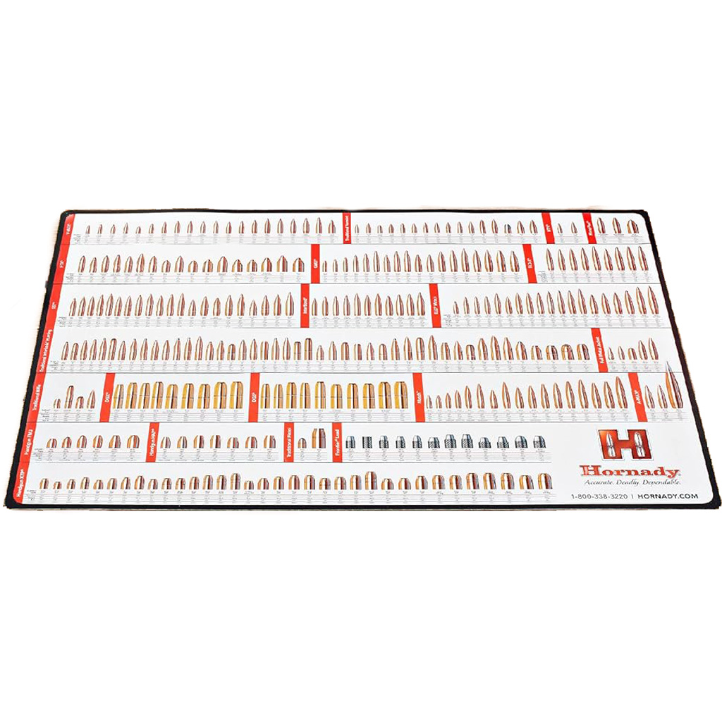 The Hornady Reloading Counter Mat serves as a comprehensive reference for reloaders, with a non-skid surface displaying details of Hornady’s bullet range, including caliber, diameter, weight, ballistic coefficient, sectional density, and item numbers. It also functions as a protective layer for workbenches, resisting solvents and oils due to its slick plastic coating, which allows for easy cleaning. The mat is designed for both reloading reference and bench maintenance.