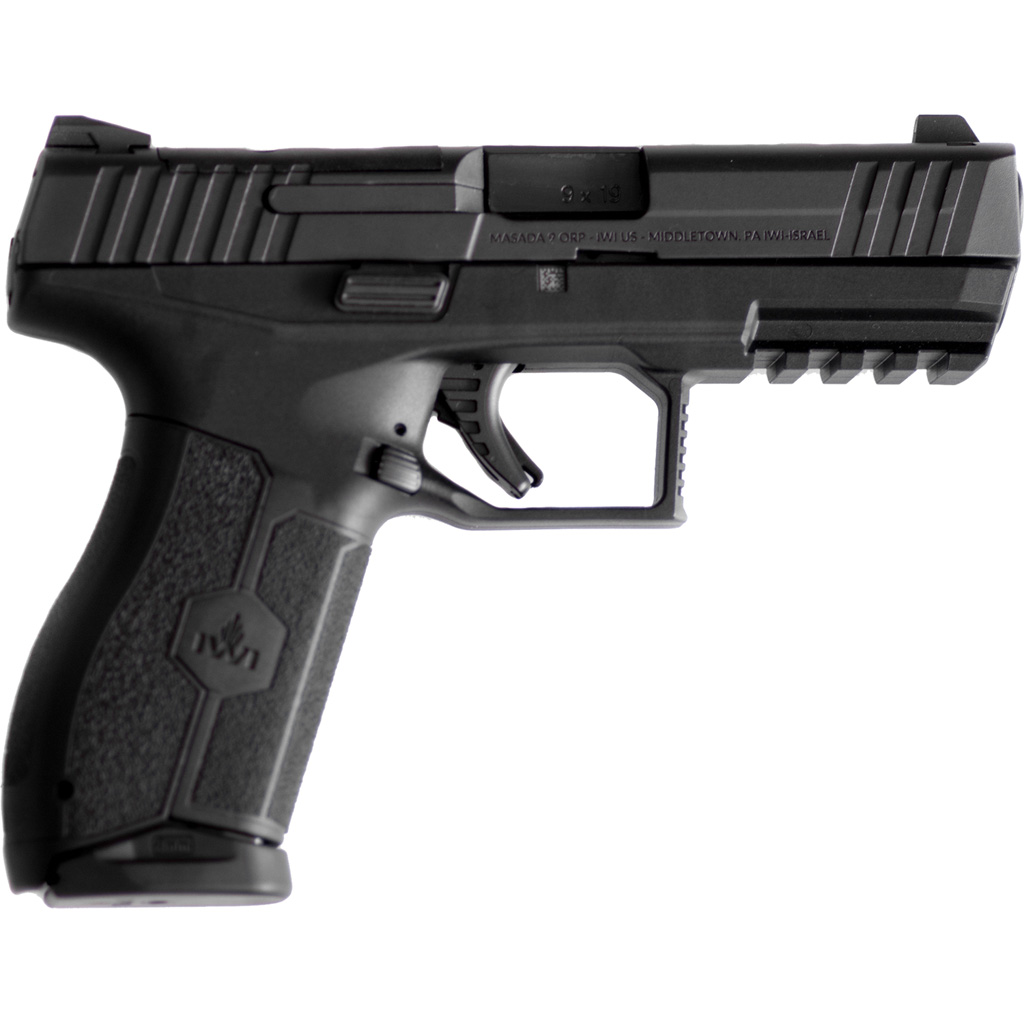 IWI MASADA 9 mm polymer framed striker-fire pistol features a low profile barrel for reduced perceived recoil. Fully ambidextrous controls and enhanced ergonomics provides a natural and instinctive pointing grip angle. Three interchangeable wrap around back-straps coupled with the deep beavertail enabling the MASADA pistol to fit a wide variety of hand sizes. The frame is constructed of high strength, impact resistant fiberglass reinforced polymers and built to withstand and endure all types of military and extremely harsh environmental conditions. The trigger is designed with a 6 lb. trigger pull and a clean crisp break with a positive reset. The built-in trigger safety prevents the pistol from firing unless the trigger is pulled.