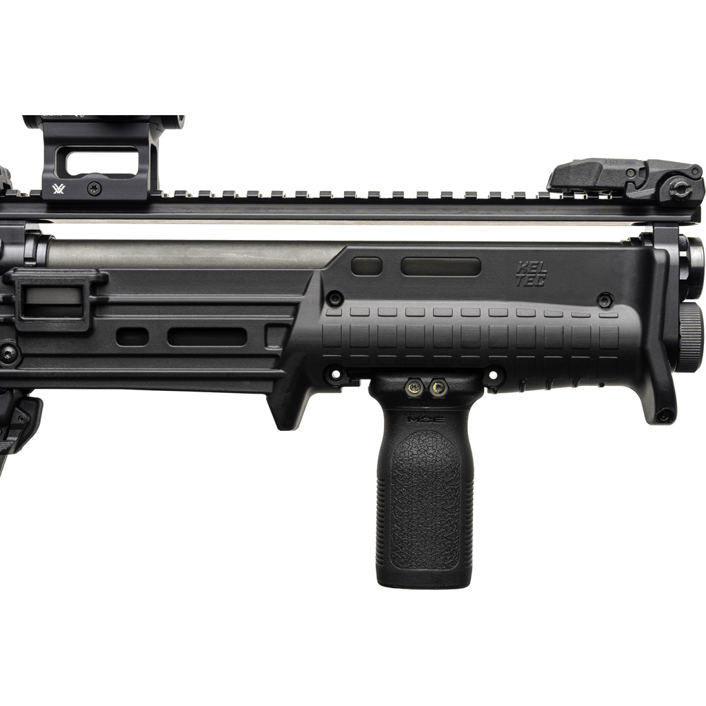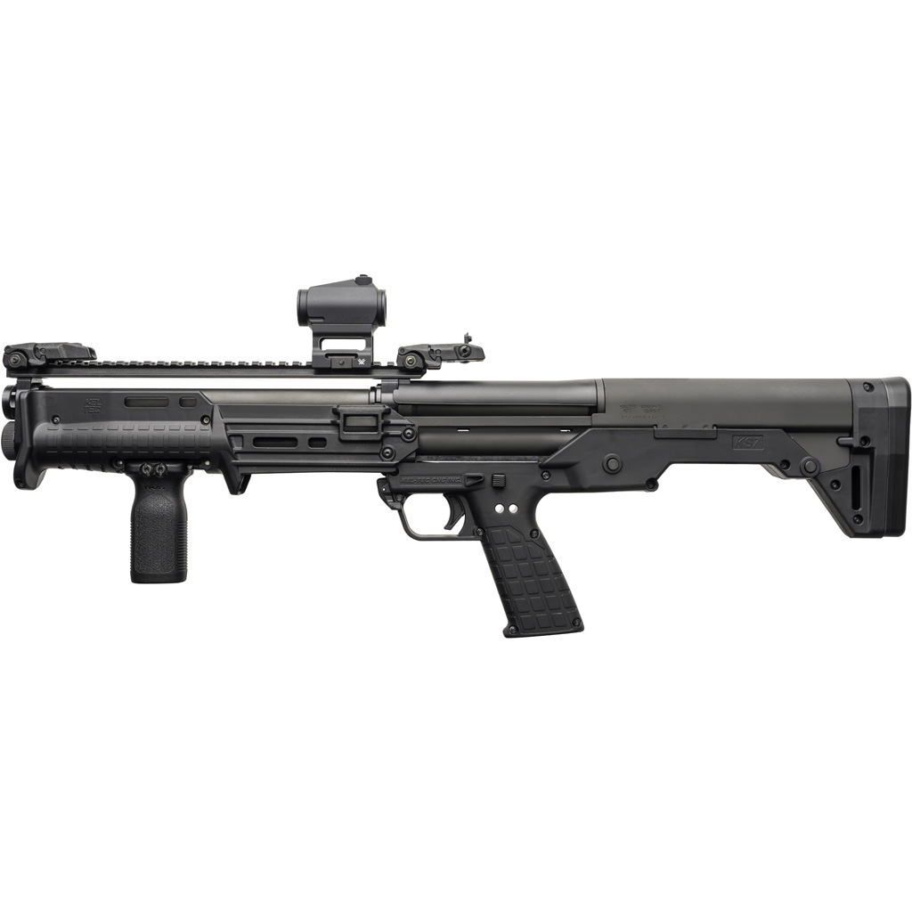The second generation of the KS7 Gen 2 adds features for versatility and adaptability. The flat continuous top Pic rail was added for accessory mounting. The fore end slide now has a removeable plate on the hand guard that exposes a Pic rail segment for vertical foregrips. The Defender Model comes with MagPul flip up sights, MagPul Vertical Foregrip and a Vortex Crossfire Green Dot. The KS7 Gen 2 keeps the same compact Bullpup design with 6 +1 round capacity and more versatility than before.