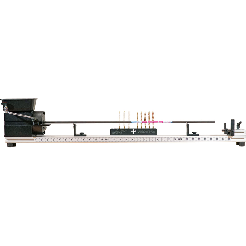 The Revolution Arrow Saw helps reduce carbon dust plus provide a combination of essential tools for arrow construction. Features include a water drip and vacuum attachment, blade and motor housing, deburr, shaft square, mop, brush, broadhead wrench and a built-in arrow spinner.