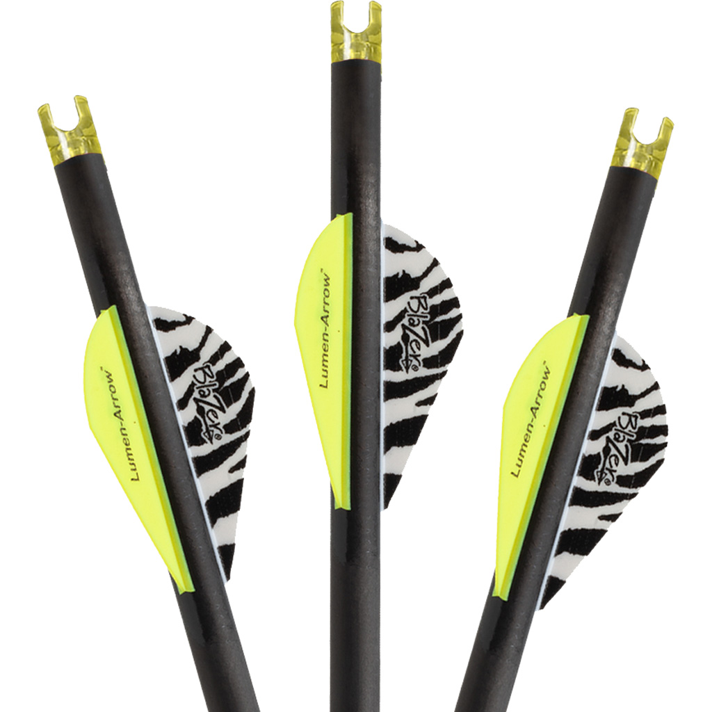 100 percent carbon crossbow bolt with Lumenok lighted nocks installed. Bolts are squared on the nock end to ensure proper functioning of the lighted nock. Factory fletched with 2″ Blazer vanes. Length: 20″. Includes brass inserts. Weight: 338 gr. (without point).