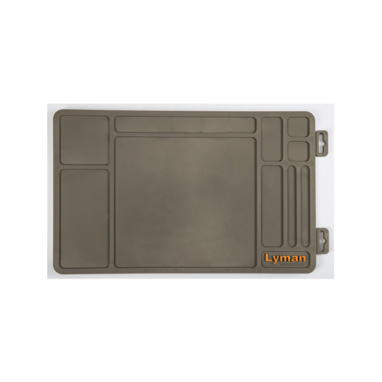 Work like a pro on your Lyman Gun Cleaning Mat. The firm yet cushioned surface is perfect for assembling and disassembling firearms (or lots of other hobbies!) for gun cleaning or maintenance and repair. The molded compartments contain spills and keep small parts out of the way of the main work area but still handy and organized. The Essential Gun Maintenance Mat by Lyman is chemical resistant and cleans with soap and water . Measures 15.75 x 10. – Chemical Resistant – Made from synthetic rubber for a non-slip surface – Protects your gun’s finish and your bench’s finish – Moulded-in storage compartments keep parts secured and organized