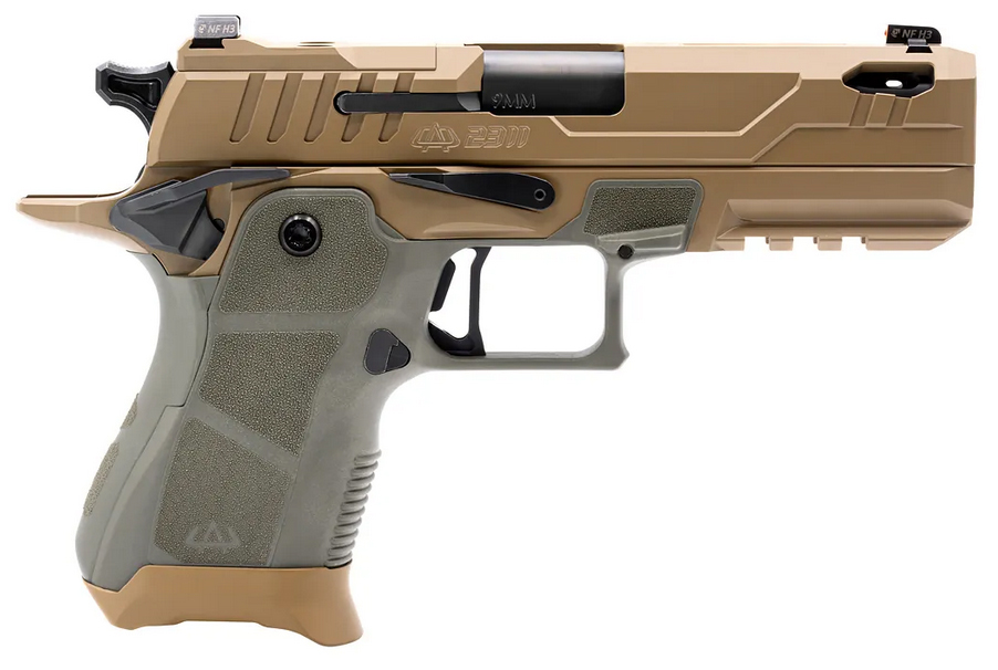 The OA 2311 Compact Pro is the ultimate EDC and personal defense platform; optimized to provide maximum speed accuracy and control in all conditions. The contoured lightening-cut slide and barrel porting reduce felt recoil and minimize muzzle rise even with +P self-defense ammunition. The progressive texture on the polymer grip provides traction where you need it most while minimizing discomfort for AIWB carry applications. The enhanced Pro trigger treatment yields a slightly lighter trigger pull than the standard duty model triggers facilitating an even smoother trigger break for increased accuracy and feel. With five magazines and four slide plates included in the kit the OA 2311 arrives with everything you need to maximize your performance. – Contoured slide and optional ported barrel reduce muzzle rise – High Desert Exclusive Finish (Coyote / Sage) – Ships with five (5) magazines for utility and convenience – Enhanced 3.5-4.0lb Pro trigger + Springer Precision Extended Mag Release Paddle – HIGH DESERT FINISH – Bred in the mountains of the Battle Born state our new High Desert Finish for the OA 2311 pays homage to our Nevada heritage and our function-first design ethos. This treatment pulls its color palette from the arid deserts and sage-covered mountains that surround our headquarters here in Dayton. Finished in Cerakote Elite E-190 the High Desert Finish can be ordered with either a black grip or a sage green grip to complete the pistol. – KIT INCLUDES – OA 2311 Compact Pro pistol in High Desert finish with Sage grip module – (5) 15-round OA magazines – (4) Slide Plates Iron sight cover plate; RMR DPP & Holosun K/RMSc footprint optic mounting plates – Night Fision tritium night sights (standard height installed; intermediate height for RMR optic plate; suppressor height front sight for use with DPP optic plate) – Owners Manual & Firearm Safety Literature – Cable Safety Lock – Custom OA Defense range bag by Savior Equipment – SPECIFICATIONS – CALIBER 9x19mm – BARREL LENGTH 4.25 – DIMENSIONS 7.75 L 5.10 H 1.40 W – WEIGHT (UNLOADED) 25oz – TRIGGER WEIGHT 3.5-4.0lbs – CAPACITY 15+1 Rounds – FRAME 7075 Aluminum – GRIP Polymer (Sage)