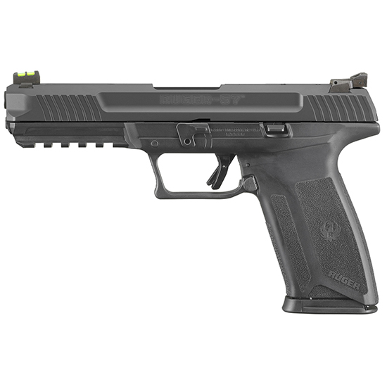 Caliber: 5.7x28mm – Capacity: 20+1 – Grip Frame: High-Performance Glass-Filled Nylon – Barrel Length: 4.94 – Overall Length: 8.65 – Barrel Material: Alloy Steel – Barrel Finish: Black Nitride – Front Sight: Fiber Optic – Rear Sight: Adjustable – Slide Material: Alloy Steel – Slide Finish: Black Oxide – Weight: 24.5 oz. – Slide Width: 1.20 – Height: 5.60 – Grooves: 8 – Twist: 1:9 RH – Impressive ergonomics include an easy trigger reach robust slide release and reversible magazine release latch. – Through hardened billet steel slide with lightening cuts is drilled and tapped for easy mounting of optics with separately available optic adapter plate. – Windage and elevation adjustable serrated rear sight and rapid acquisition fiber optic front sight for fast accurate shooting. – The alloy steel barrel features a black nitride treatment for wear resistance. – Steel magazine provides double stack capacity without unnecessary bulk. – Textured ergonomic frame provides a secure and comfortable grip. – Utilizes Ruger’s safe reliable and proven Secure Action fire-control system that combines a protected internal hammer with a bladed-safety trigger. The trigger has a short smooth pull clean break and positive reset. – Safe easy takedown with no tools or trigger pull required. – Inspection port allows for visual confirmation of a loaded or empty chamber. – Picatinny-style accessory rail for easy mounting of lights and lasers. – Safety features include: Integrated trigger safety; light-weight firing pin; neutrally balanced sear with significant engagement and strong spring tension; and hammer catch to help prevent the hammer from contacting the firing pin unless the trigger is pulled. – Magazine drops free on release for convenient reloading. – Also includes: two steel magazines.