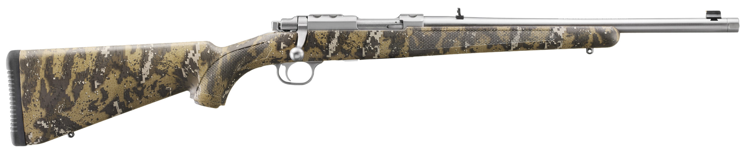 Caliber: 44 Rem Mag – Stock Desolve Bare Reduced Camo Synthetic – Front Sight Gold Bead – Rear Sight Adjustable – Barrel Length 16.60 – Capacity 4 – Material Stainless Steel – Finish Brushed Stainless – Weight 5.5 lb. – Twist 1:20 RH – Thread Pattern 5/8-24 – Overall Length 36 – Length of Pull 13.50 – Grooves 6 – Threaded cold hammer-forged barrel with factory-installed thread protector results in ultra-precise rifling that provides exceptional accuracy and longevity. – Features a rugged stainless steel bolt with 90° bolt throw and rapid lock time for added accuracy. – Detachable rotary magazine features a unique rotor to separate cartridges and provide reliable feeding. Mounts flush with the stock to eliminate protrusions at the rifle’s balance point. – Integral scope mounts machined directly on the solid-steel receiver provide a stable mounting surface for included scope rings eliminating a potential source of looseness and inaccuracy in the field. – Three-position safety is easily accessible and allows the shooter to lock the bolt to load and unload the rifle with the safety engaged. – Also includes: sling swivel studs.