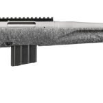 Caliber: 6.5 Grendel – StockGray Splatter Gen II American – Barrel Fluting Spiral – Barrel Length 20 – Barrel Finish Gun Metal Gray Cerakote – Thread Pattern 5/8-24 – Capacity 10 – Magazine Type AR-Style – Sights None-Picatinny Scope Base – Material Alloy Steel – Weight 6.5 lb. – Twist 1:8 RH – Overall Length 41.25 – Length of Pull 12-13.75 – Grooves 5 – Splatter finished stock provides excellent grip without being too sharp or abrasive. – Soft rubber recoil pad features a large radius on the heel for easy shouldering and improved geometry that progressively collapses to reduce felt recoil. – Removing the installed spacer allows for length of pull to be adjusted from 13.75 to 12. – Installed low comb improves sight alignment when using magnified optics but can be removed when utilizing low-mounted sights. More comb options are available at ShopRuger.com to further refine the fit. – Professionally applied Cerakote coating on barrel muzzle brake receiver and bolt handle results in a durable easy-to-maintain finish. – Medium contour barrel features deep spiral flutes that reduce weight at the muzzle end of the barrel to improve balance without sacrificing stiffness or accuracy. – Threaded barrel with factory-installed radial port muzzle brake is cold hammer-forged resulting in ultra-precise rifling that provides exceptional accuracy and longevity. – Intuitive three-position tang safety locks the bolt preventing inadvertent bolt opening while allowing the rifle to be loaded with the safety engaged. – Ruger Marksman Adjustable trigger offers a crisp release with a pull weight that is user-adjustable between 3 and 5 pounds. – Patented Power Bedding integral bedding block system positively locates the receiver and free-floats the barrel for outstanding accuracy. – The one-piece bolt is CNC machined from stainless steel for smooth operation and the familiar three-lug design with 70° throw provides ample scope clearance. – Oversized bolt handle for positive bolt manipulation with a 5/16-24 thread pattern for easy replacement. – Factory-installed one-piece Picatinny scope base. – Available accessory stock weight kit adds up to 1.6 pounds to the butt of the rifle to absorb recoil and improve the rifle’s balance when utilizing heavier muzzle devices. – Also includes: one magazine; steel sling swivel studs.