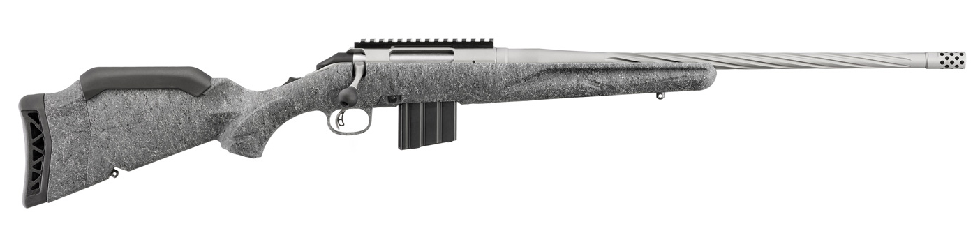 Caliber: 6mm ARC – StockGray Splatter Gen II American – Barrel Fluting Spiral – Barrel Length 20 – Barrel Finish Gun Metal Gray Cerakote – Thread Pattern 5/8-24 – Capacity 10 – Magazine Type AR-Style – Sights None-Picatinny Scope Base – Material Alloy Steel – Weight 6.5 lb. – Twist 1:7.7 RH – Overall Length 41.25 – Length of Pull 12-13.75 – Grooves 5 – Splatter finished stock provides excellent grip without being too sharp or abrasive. – Soft rubber recoil pad features a large radius on the heel for easy shouldering and improved geometry that progressively collapses to reduce felt recoil. – Removing the installed spacer allows for length of pull to be adjusted from 13.75 to 12. – Installed low comb improves sight alignment when using magnified optics but can be removed when utilizing low-mounted sights. More comb options are available at ShopRuger.com to further refine the fit. – Professionally applied Cerakote coating on barrel muzzle brake receiver and bolt handle results in a durable easy-to-maintain finish. – Medium contour barrel features deep spiral flutes that reduce weight at the muzzle end of the barrel to improve balance without sacrificing stiffness or accuracy. – Threaded barrel with factory-installed radial port muzzle brake is cold hammer-forged resulting in ultra-precise rifling that provides exceptional accuracy and longevity. – Intuitive three-position tang safety locks the bolt preventing inadvertent bolt opening while allowing the rifle to be loaded with the safety engaged. – Ruger Marksman Adjustable trigger offers a crisp release with a pull weight that is user-adjustable between 3 and 5 pounds. – Patented Power Bedding integral bedding block system positively locates the receiver and free-floats the barrel for outstanding accuracy. – The one-piece bolt is CNC machined from stainless steel for smooth operation and the familiar three-lug design with 70° throw provides ample scope clearance. – Oversized bolt handle for positive bolt manipulation with a 5/16-24 thread pattern for easy replacement. – Factory-installed one-piece Picatinny scope base. – Available accessory stock weight kit adds up to 1.6 pounds to the butt of the rifle to absorb recoil and improve the rifle’s balance when utilizing heavier muzzle devices. – Also includes: one magazine; steel sling swivel studs.
