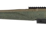 Caliber: 450 Bushmaster – Stock Green Splatter Gen II American – Barrel Fluting Spiral – Barrel Length 22 – Barrel Finish Burnt Bronze Cerakote – Thread Pattern 11/16-24 – Capacity 3 – Magazine Type Single-Stack – Sights None-Picatinny Scope Base – Material Alloy Steel – Weight 6.4 lb. – Twist 1:16 RH – Overall Length 43.25 – Length of Pull 12-13.75 – Grooves 5 – Splatter finished stock provides excellent grip without being too sharp or abrasive. – Soft rubber recoil pad features a large radius on the heel for easy shouldering and improved geometry that progressively collapses to reduce felt recoil. – Removing the installed spacer allows for length of pull to be adjusted from 13.75 to 12. – Installed low comb improves sight alignment when using magnified optics but can be removed when utilizing low-mounted sights. – Professionally applied Cerakote coating on barrel muzzle brake receiver and bolt handle results in a durable easy-to-maintain finish. – Medium contour barrel features deep spiral flutes that reduce weight at the muzzle end of the barrel to improve balance without sacrificing stiffness or accuracy. – Threaded barrel with factory-installed radial port muzzle brake is cold hammer-forged resulting in ultra-precise rifling that provides exceptional accuracy and longevity. – Intuitive three-position tang safety locks the bolt preventing inadvertent bolt opening while allowing the rifle to be loaded with the safety engaged. – Ruger Marksman Adjustable trigger offers a crisp release with a pull weight that is user-adjustable between 3 and 5 pounds. – Patented Power Bedding integral bedding block system positively locates the receiver and free-floats the barrel for outstanding accuracy. – The one-piece bolt is CNC machined from stainless steel for smooth operation and the familiar three-lug design with 70° throw provides ample scope clearance. – Oversized bolt handle for positive bolt manipulation with a 5/16-24 thread pattern for easy replacement. – Factory-installed one-piece Picatinny scope base. – Available accessory stock weight kit adds up to 1.6 pounds to the butt of the rifle to absorb recoil and improve the rifle’s balance when utilizing heavier muzzle devices. – Also includes: one magazine; steel sling swivel studs.