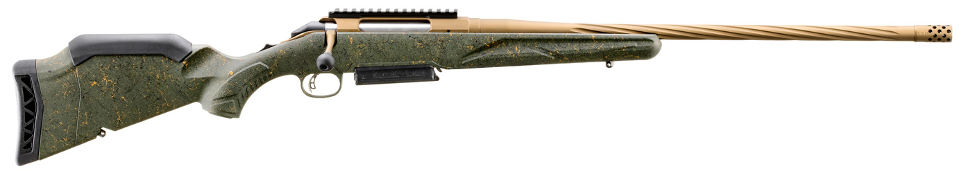 Caliber: 6.5 PRC – Stock Green Splatter Gen II American – Barrel Fluting Spiral – Barrel Length 22 – Barrel Finish Burnt Bronze Cerakote – Thread Pattern 5/8-24 – Capacity 3 – Magazine Type Single-Stack – Sights None-Picatinny Scope Base – Material Alloy Steel – Weight 6.7 lb. – Twist 1:8 RH – Overall Length 43.25 – Length of Pull 12-13.75 – Grooves 5 – Splatter finished stock provides excellent grip without being too sharp or abrasive. – Soft rubber recoil pad features a large radius on the heel for easy shouldering and improved geometry that progressively collapses to reduce felt recoil. – Removing the installed spacer allows for length of pull to be adjusted from 13.75 to 12. – Installed low comb improves sight alignment when using magnified optics but can be removed when utilizing low-mounted sights. – Professionally applied Cerakote coating on barrel muzzle brake receiver and bolt handle results in a durable easy-to-maintain finish. – Medium contour barrel features deep spiral flutes that reduce weight at the muzzle end of the barrel to improve balance without sacrificing stiffness or accuracy. – Threaded barrel with factory-installed radial port muzzle brake is cold hammer-forged resulting in ultra-precise rifling that provides exceptional accuracy and longevity. – Intuitive three-position tang safety locks the bolt preventing inadvertent bolt opening while allowing the rifle to be loaded with the safety engaged. – Ruger Marksman Adjustable trigger offers a crisp release with a pull weight that is user-adjustable between 3 and 5 pounds. – Patented Power Bedding integral bedding block system positively locates the receiver and free-floats the barrel for outstanding accuracy. – The one-piece bolt is CNC machined from stainless steel for smooth operation and the familiar three-lug design with 70° throw provides ample scope clearance. – Oversized bolt handle for positive bolt manipulation with a 5/16-24 thread pattern for easy replacement. – Factory-installed one-piece Picatinny scope base. – Available accessory stock weight kit adds up to 1.6 pounds to the butt of the rifle to absorb recoil and improve the rifle’s balance when utilizing heavier muzzle devices. – Also includes: one magazine; steel sling swivel studs.
