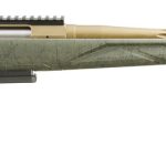 Caliber: 7mm-08 Rem – Stock Green Splatter Gen II American – Barrel Fluting Spiral – Barrel Length 22 – Barrel Finish Burnt Bronze Cerakote – Thread Pattern 5/8-24 – Capacity 3 – Magazine Type AI-Style – Sights None-Picatinny Scope Base – Material Alloy Steel – Weight 6.6 lb. – Twist 1:8.5 RH – Overall Length 43.25 – Length of Pull 12-13.75 – Grooves 5 – Splatter finished stock provides excellent grip without being too sharp or abrasive. – Soft rubber recoil pad features a large radius on the heel for easy shouldering and improved geometry that progressively collapses to reduce felt recoil. – Removing the installed spacer allows for length of pull to be adjusted from 13.75 to 12. – Installed low comb improves sight alignment when using magnified optics but can be removed when utilizing low-mounted sights. – Professionally applied Cerakote coating on barrel muzzle brake receiver and bolt handle results in a durable easy-to-maintain finish. – Medium contour barrel features deep spiral flutes that reduce weight at the muzzle end of the barrel to improve balance without sacrificing stiffness or accuracy. – Threaded barrel with factory-installed radial port muzzle brake is cold hammer-forged resulting in ultra-precise rifling that provides exceptional accuracy and longevity. – Intuitive three-position tang safety locks the bolt preventing inadvertent bolt opening while allowing the rifle to be loaded with the safety engaged. – Ruger Marksman Adjustable trigger offers a crisp release with a pull weight that is user-adjustable between 3 and 5 pounds. – Patented Power Bedding integral bedding block system positively locates the receiver and free-floats the barrel for outstanding accuracy. – The one-piece bolt is CNC machined from stainless steel for smooth operation and the familiar three-lug design with 70° throw provides ample scope clearance. – Oversized bolt handle for positive bolt manipulation with a 5/16-24 thread pattern for easy replacement. – Factory-installed one-piece Picatinny scope base. – Available accessory stock weight kit adds up to 1.6 pounds to the butt of the rifle to absorb recoil and improve the rifle’s balance when utilizing heavier muzzle devices. – Also includes: one magazine; steel sling swivel studs.