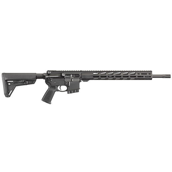Caliber: 5.56 NATO – Stock: Black Synthetic Collapsible – Handguard: Free-Float With Magpul® M-LOK® Slots – Sights: None – Barrel Length: 18 – Thread Pattern: 1/2-28 – Twist: 1:8 RH – Capacity: 10 – Finish: Type III Hard Coat Anodized – Height: 8 – Weight: 6.8 lb. – Overall Length: 35 – 38.25 – Length of Pull: 11.10 – 14.40 – Grooves: 5 – Lower receiver is fitted with Magpul® MOE® grip and MOE SL® collapsible buttstock on a Mil-Spec buffer tube. – Handguard is free-floated for accuracy and the slim 15 length provides enhanced ergonomics. – Bolt is mil-spec 9310 and is machined and shot peened for strength and durability. – The Ruger® Elite 452® AR-Trigger is a two-stage trigger that offers a smooth crisp 4.5 pound trigger pull. It features a full-strength hammer spring for consistent primer ignition and a lightweight hammer that enables a faster lock time for improved accuracy. – Magpul® M-LOK® accessory attachment slots along the 3:00 6:00 and 9:00 positions with additional slots on the angled faces near the muzzle. – Ruger® muzzle brake is a radial port design that significantly reduces felt recoil and muzzle movement. The threaded barrel allows for standard muzzle accessories to be installed. – Cold hammer-forged 4140 chrome-moly steel barrel with ultra-precise rifling provides exceptional accuracy longevity and easy cleaning. The 1:8 twist rate stabilizes bullets from 35 to 77 grains and the 5.56 NATO chamber allows the use of both 5.56 NATO and .223 Rem. ammunition. M4 feed ramps provide improved reliability and the matte black nitrided finish provides corrosion resistance. – Made from aerospace-grade 7075-T6 aluminum forging the flat top upper receiver includes a forward assist dust cover and brass deflector and is Type III hard coat anodized for maximum durability. – Bolt carrier and gas key have chrome-plated inside diameters to provide exceptional resistance to hot gases. The gas key is staked so that it will not loosen after extensive firing. – Rifle-length gas system provides smoother operation and reduces felt recoil. – Also includes: one 10-round metal magazine.