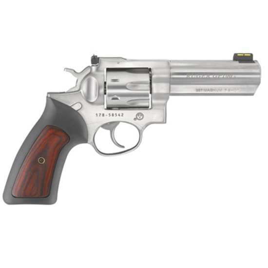 Caliber: 357 Mag – Grips: Cushioned Rubber with Hardwood Insert – Front Sight: Fiber Optic – Barrel Length: 4.20 – Material: Stainless Steel – Capacity: 7 – Rear Sight: Adjustable – Twist: 1:18.75 RH – Finish: Satin Stainless – Overall Length: 9.50 – Weight: 40 oz. – Grooves: 5 – Triple-locking cylinder is locked into the frame at the front rear and bottom for more positive alignment and dependable operation shot after shot. – Patented grip frame design easily accommodates a wide variety of custom grips. – Takedown of integrated subassemblies requires no special tools and allows for easy maintenance and assembly. – Patented transfer bar mechanism provides an unparalleled measure of security against accidental discharge.