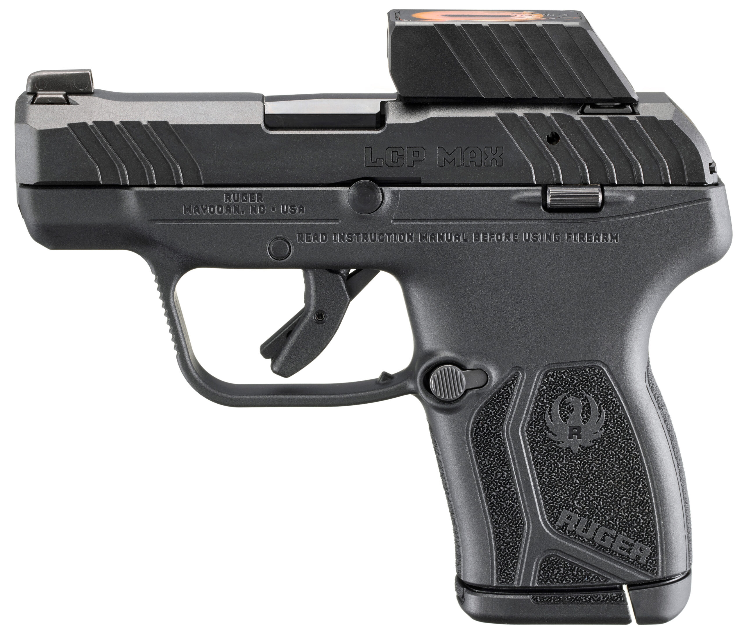 Caliber: 380 Auto – Capacity 10+1 – Slide Material Alloy Steel – Slide Finish Black Nitride – Slide Width 0.75 – Manual Safety No – Grip Frame Black High-Performance Glass-Filled Nylon – Barrel Material Alloy Steel – Barrel Finish Black Nitride – Barrel Length 2.80 – Overall Length 5.17 – Front Sight Tritium with White Outline – Rear SightReadyDot Micro Reflex – Weight 11 oz. – Height 4.52 – Grooves 6 – Twist 1:16 RH – Features a factory-mounted co-witnessed Ruger® ReadyDot® micro reflex sight featuring a large 15 MOA red aiming dot. Light-gathering fiber optic automatically adjusts to the light conditions. Waterproof and shock resistant with no batteries or buttons for ultimate reliability. – Compact and lightweight the LCP® MAX continues to be the definitive pocket-sized personal protection pistol. – Standard 10-round magazine ships with flush floorplate installed. – Textured grip frame provides a secure and comfortable grip. Utilizing the 12-round magazine or included finger grip extension floorplate with the 10-round magazine allows most shooters a full-firing grip. – Slide and frame surfaces and edges are smooth for comfortable carry and handling. – Tritium front sight with white outline makes for fast acquisition in all light conditions. – Sight dovetails are sized to accept aftermarket Bodyguard-pattern sights. – Improved magazine feed lips feed ramp extractor and barrel cam geometries. – Patented barrel cam geometry delays unlocking slows the slide and ultimately reduces felt recoil compared to other .380 Auto pistols. – Utilizes Ruger’s safe reliable and proven Secure Action fire-control system that combines a protected internal hammer with a bladed-safety trigger. The trigger has a short smooth pull clean break and positive reset. – Reversible magazine release. – Also includes: one 10-round magazine; optic compatible soft pocket holster; magazine loader.