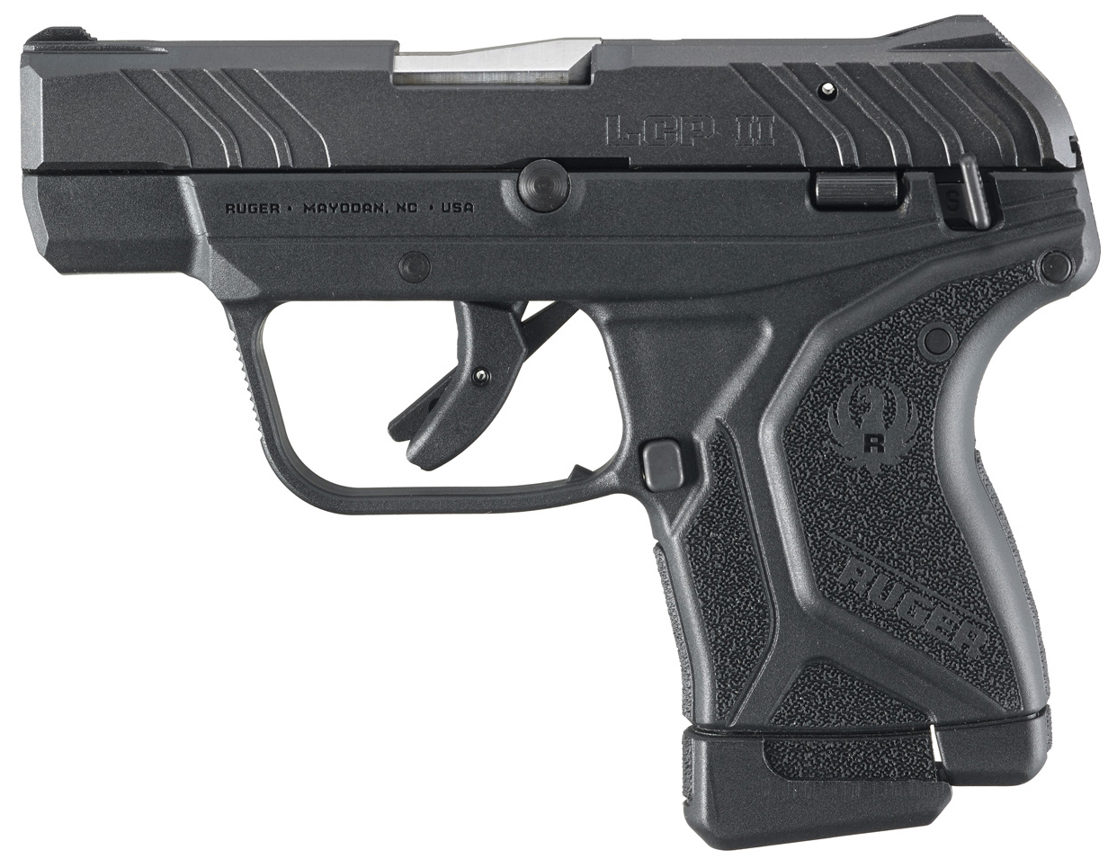 Caliber: 22 LR – Capacity: 10+1 – Barrel Length: 2.75 – Overall Length: 5.20 – Weight: 11.2 oz. – Grip Frame: Black High-Performance Glass-Filled Nylon – Grooves: 6 – Feature: Lite Rack System – Slide Material: Alloy Steel – Barrel Material: Stainless Steel – Slide Width: 0.81 – Sights: Integral – Twist: 1:16 RH – Slide Finish: Black Oxide – Barrel Finish: Satin Stainless – Height: 4 – Available in CA: Yes – Lite Rack system includes refined slide serrations pronounced cocking ears and a lighter recoil spring allowing for easy slide manipulation. – Low recoil for comfortable training. Optimized to function with high-velocity ammunition. – With a patented floorplate assembly the magazine offers a very compact 10-round capacity extends the grip for improved control and retains the LCP® II’s popular last-round hold open function. – Manual safety is oriented in a push-forward-to-fire configuration that is instinctive and unobtrusive. – Compact and lightweight the LCP® II is designed to fit a variety of holsters. – Textured grip frame provides a secure and comfortable grip. Larger grip frame surface provides better distribution of recoil forces. – Fixed front and rear sights are integral to the slide while the hammer is recessed within the slide. – Rugged construction with through-hardened steel slide and one-piece high-performance glass-filled nylon grip frame. – Utilizes Ruger’s safe reliable and proven Secure Action fire-control system that combines a protected internal hammer with a bladed-safety trigger. The trigger has a short smooth pull clean break and positive reset. – Additional safety features include a magazine disconnect; neutrally balanced sear with significant engagement and strong spring tension; and hammer catch to help prevent the hammer from contacting the firing pin unless the trigger is pulled. – Satin stainless steel barrel. – Accepts most existing LCP® II accessories with the exception of magazines chambered in .380 Auto. – Also includes: one magazine and magazine loader.