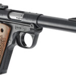 Caliber: 22 LR – Capacity 10+1 – Receiver Material Alloy Steel – Front Sight Fixed – Barrel Length 5.50 – Grip Frame Polymer – Grips Engraved American Walnut – Finish Blued – Width 1.22 – Rear Sight Adjustable – Barrel StyleThreaded Bull – Weight 34.4 oz. – Overall Length 9.75 – Height 5.50 – Grooves 6 – Twist 1:16 RH – Collector’s Series Mark IV 22/45 models feature oak leaf and basket weave pattern engraved American walnut grip panels and include a 2025 Collector’s Series metal license plate decal and lapel pin. – Simple one-button takedown for quick and easy field-stripping and proper chamber-to-muzzle cleaning. Pressing a button in the back of the frame allows the barrel-receiver assembly to tilt up and off the grip frame without the use of tools. – Comfortable precision-molded polymer grip frame with a serrated frontstrap and checkered backstrap. – 1/2-28 threaded barrel with thread protector allows for the attachment of popular muzzle accessories. – Cold hammer-forged barrel results in ultra-precise rifling that provides exceptional accuracy and longevity. – Ergonomic bolt stop. – 1911-style grip panels for a great appearance and comfortable non-slip hold. – Internal cylindrical bolt construction ensures permanent sight-to-barrel alignment and higher accuracy potential than conventional moving-slide designs. – Contoured ejection port and easy-to-grasp bolt ears allow for durable and reliable operation round after round. – Accurate sighting system features a drilled and tapped receiver for Weaver- or Picatinny-style rail for easy mounting of optics. – Ambidextrous manual safety can be converted to left-side only with included washer. – Features a conveniently located push-button magazine release on the left side of the frame. – Magazine drops free on release for convenient reloading. – Magazine disconnect prevents discharge when the magazine has been removed. – Also includes: two 10-round magazines.