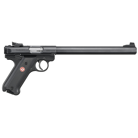 Caliber: 22 LR – Capacity: 10+1 – Material: Alloy Steel – Front Sight: Fixed – Barrel Length: 10 – Grip Frame: Aluminum – Grips: Checkered Synthetic – Finish: Blued – Width: 1.20 – Rear Sight: Adjustable – Barrel Style: Bull – Weight: 46.3 oz. – Overall Length: 14 – Height: 5.50 – Grooves: 6 – Twist: 1:16 RH – Simple one-button takedown for quick and easy field-stripping and proper chamber-to-muzzle cleaning. Pressing a button in the back of the frame allows the barrel-receiver assembly to tilt up and off the grip frame without the use of tools. – One-piece precision CNC-machined grip frame. – Cold hammer-forged barrel results in ultra-precise rifling that provides exceptional accuracy and longevity. – Ergonomic bolt stop. – Smoothly contoured comfortable grip features a natural pointing grip angle with replaceable grip panels for a non-slip hold. – Internal cylindrical bolt construction ensures permanent sight-to-barrel alignment and higher accuracy potential than conventional moving-slide designs. – Contoured ejection port and easy-to-grasp bolt ears allow for durable and reliable operation round after round. – Accurate sighting system features a drilled and tapped receiver for Weaver- or Picatinny-style rail for easy mounting of optics. – Ambidextrous manual safety can be converted to left-side only with included washer. – Features a conveniently located push-button magazine release on the left side of the frame. – Magazine drops free on release for convenient reloading. – Magazine disconnect prevents discharge when the magazine has been removed. – Also includes: two 10-round magazines.