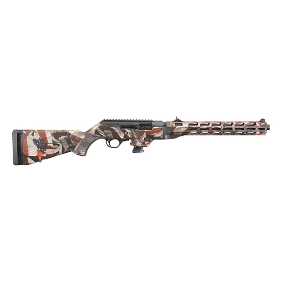 Caliber: 9mm Luger – Stock: American Flag Camo Synthetic with Aluminum Free-Float Handguard – Capacity: 10 – Barrel Length: 16.12 – Overall Length: 34.37 – Front Sight: Protected Blade – Rear Sight: Adjustable Ghost Ring – Barrel Feature: Non-Threaded Fluted – Weight: 7 lb. – Length of Pull: 12.62-14.12 – Material: Aluminum Alloy – Finish: American Flag Camo – Twist: 1:10 RH – Grooves: 6 – This model ships with a 10-round magazine and non-threaded barrel for consumers in those states which limit magazine capacity and have feature-based restrictions. – Interchangeable magazine wells for use of common Ruger® and Glock® magazines. Ships with SR-Series/Security-9® pistol magazine well installed and an additional magazine well accepting Glock® magazines is included*. – Easy takedown enables quick separation of the barrel/forend assembly from the action for ease of transportation and storage. Takedown is as simple as locking the bolt back and verifying that the rifle is unloaded pushing a recessed lever twisting the subassemblies and pulling them apart. – Dead blow action features a custom tungsten dead blow weight that shortens bolt travel and reduces felt recoil and muzzle rise. Bolt is machined from heat treated chrome-moly steel to ensure strength structural integrity and durability. – Reversible magazine release and reversible charging handle to support ambidextrous use or one-handed control manipulation while maintaining a proper firing grip*. – Cold hammer-forged chrome-moly steel barrel with ultra-precise rifling provides exceptional accuracy and longevity. The heavy contour barrel provides consistent accuracy while barrel fluting sheds unnecessary weight and allows for quick handling. – Soft rubber buttpad with spacers allows the rifle to be properly sized for different shooters or varying levels of outerwear or defensive gear (three 1/2 spacers included). – Durable glass-filled nylon synthetic buttstock features a proprietary texture for enhanced control and an integral sling mount for rapid sling attachment . – Light crisp trigger pull with minimal overtravel and positive reset utilizing proven 10/22® trigger components. – CNC-machined from an aerospace-grade 7075-T6 aluminum billet the receiver includes an integrated Picatinny-style rail and is Type III hard-coat anodized for maximum durability. – Also includes: one SR-Series pistol magazine and hex wrenches for rear sight adjustment buttpad spacer adjustment and charging handle removal. – Color and shade may vary from photo.