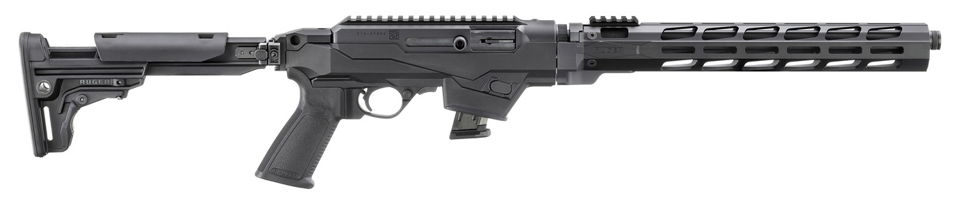 Caliber: 9mm Luger – Stock Folding and Adjustable Black Synthetic Chassis with Aluminum Free-Float Handguard – Capacity 10 – Barrel Length 16.12 – Overall Length 33.75 – Front Sight None – Rear Sight None – Barrel Feature Threaded Fluted – Thread Pattern 1/2-28 – Weight 7.3 lb. – Length of Pull 11-13 – Receiver Material Aluminum Alloy – Receiver Finish Type III Hard-Coat Anodized – Twist 1:10 RH – Grooves 6 – CNC-milled handguard that is Type III hard-coat anodized aluminum for maximum durability with Magpul® M-LOK® accessory attachment slots on all four sides for easy mounting of M-LOK-compatible rails and accessories. – Factory-installed barrel-mounted picatinny rail allows for the forward mounting of optics. – Interchangeable magazine wells for use of common Ruger® and Glock® magazines. Ships with SR-Series/Security-9® pistol magazine well installed and an additional magazine well accepting Glock® magazines is included*. – Easy takedown enables quick separation of the barrel/forend assembly from the action for ease of transportation and storage. Takedown is as simple as locking the bolt back and verifying that the rifle is unloaded pushing a recessed lever twisting the subassemblies and pulling them apart. – Dead blow action features a custom tungsten dead blow weight that shortens bolt travel and reduces felt recoil and muzzle rise. Bolt is machined from heat treated chrome-moly steel to ensure strength structural integrity and durability. – Reversible magazine release and reversible charging handle to support left- or right-handed use or one-handed control manipulation while maintaining a proper firing grip*. – Cold hammer-forged chrome-moly steel barrel with ultra-precise rifling provides exceptional accuracy and longevity. The heavy contour barrel provides consistent accuracy while barrel fluting sheds unnecessary weight and allows for quick handling. – Threaded barrel with included thread protector allows for use of standard muzzle accessories. – Chassis system features a flared magwell for improved magazine reloading capabilities as well as integrated rear-mounted QD cups. – The reversible folding stock with adjustable length of pull is compatible with both AR-pattern and Picatinny rail-mounted aftermarket accessory stocks. – Ergonomic pistol grip features an extended trigger reach for more precise trigger control. – Glass-filled polymer chassis system with integrated rear 7075-T6 aluminum picatinny rail allows for the mounting of standard AR grips and picatinny rail-mountable stocks or extensions. – Light crisp trigger pull with minimal overtravel and positive reset utilizing proven 10/22® trigger components. – CNC-machined from an aerospace-grade 7075-T6 aluminum billet the receiver includes an integrated Picatinny-style rail and is Type III hard-coat anodized for maximum durability. – Also includes: one SR-Series or Security-9® pistol magazine and hex wrenches for disassembly of the chassis and aluminum handguard as well as removal of the charging handle.