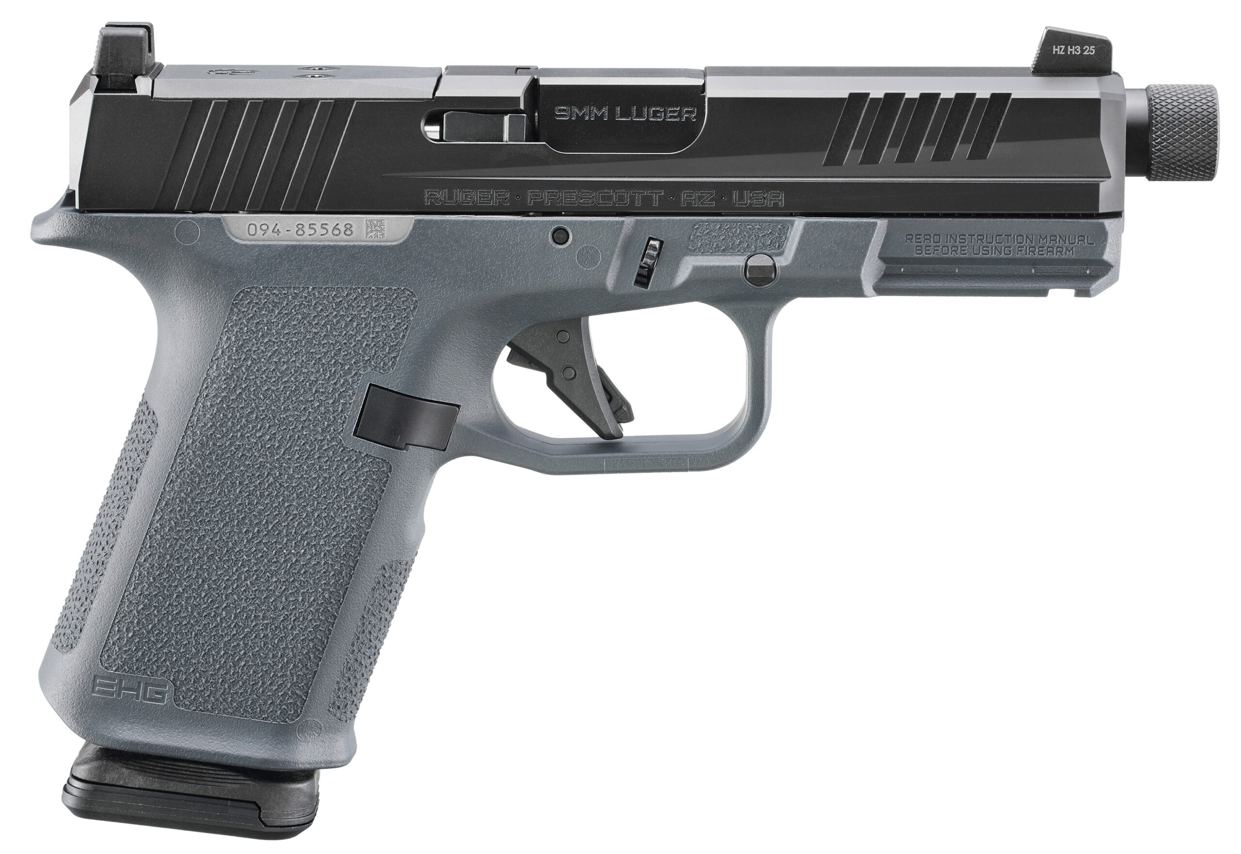 CALIBER: 9MM LUGER – Capacity 15+1 – Grip Frame Stealth Gray Magpul Enhanced Handgun Grip – Front Sight Tritium Co-Witness Height – Rear Sight Steel Drift Adjustable – Thread Pattern 1/2-28 – Manual Safety No – Magazines Included Two PMAG 15 GL9 – Optic Ready Yes – Overall Length 7.65 – Barrel Length 4 – Barrel Material Alloy Steel – Barrel Finish Black FNC Nitride – Slide Material Through-Hardened Alloy Steel – Slide Finish Black FNC Nitride – Slide Width 1 – Weight 23.6 oz. – Height 5.31 – Grooves 6 – Twist 1:10 RH – Removable serialized stainless steel Fire Control Insert (FCI) set inside an interchangeable Magpul Enhanced Handgun Grip (EHG) for maximum flexibility and customization. – Most major components designed to operate in Gen 3-type pistols and are compatible with many off-the-shelf holsters and accessories. – The Magpul EHG offers consumers premium features including Magpul’s 3/4-scale TSP texture for a secure grip without discomfort or damage to clothing during concealed carry and textured indexing pads for consistent finger / thumb placement. – Other EHG features include: a low-profile Aared magazine well for quick and easy magazine insertion; a trigger guard undercut and beaver tail that promote a high grip for better control; a magazine release scallop for easy access; and a universal-pattern accessory rail for use with a variety of lights and lasers. – 1/2-28 threaded barrel with factory-installed thread protector allows for the attachment of popular muzzle accessories. – Additional heavier 18 lb guide rod / recoil spring assembly that can be used to help tune the pistol to your chosen suppressor and ammunition. – Extended magazine release and raised slide stop. – Slide allows for direct optic mounting of RMR Delta Point Pro (DPP) and RMSc pattern optics. Co-witness-height steel sights feature a tritium night front sight providing an excellent sight picture with or without an optic installed. – Striker-fired with a Aat-faced trigger smooth trigger pull and tactile reset. – Precision riAed alloy steel barrel with FNC nitride finish. – Safety features include integrated trigger safety internal striker blocker and inspection port that allows for visual confirmation of a loaded or empty chamber. – Also includes: two Magpul PMAG 15 GL9 15-round magazines and co-branded plastic carry case.