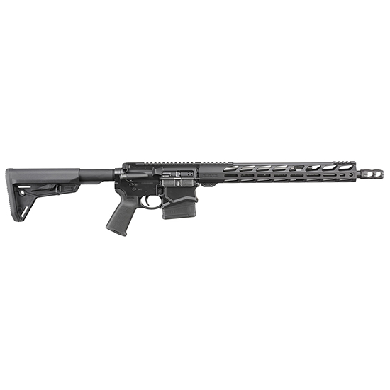 Caliber: 7.62 NATO / 308 Win – Stock: Magpul® MOE SL® – Handguard: Lite Free-Float with M-LOK® Attachment Slots – Sights: None – Barrel Length: 16.10 – Thread Pattern: 5/8-24 – Grip: Magpul® MOE® – Capacity:10 – Finish: Type III Hard-Coat Anodized – Height: 7.20 – Weight: 6.8 lb. – Twist: 1:10 RH – Overall Length: 34-37.25 – Length of Pull: 11-14.25 – Grooves: 5 – A true Small-Frame Autoloading Rifle the SFAR is nearly identical in size to a traditional 5.56-caliber modern sporting rifle. – Chambered in 7.62 NATO / .308 Win. the SFAR combines the ballistic advantages of .308 Winchester with the size of a traditional MSR. – Bolt and barrel extensions are CNC-machined from high-strength super alloy steel that outperforms traditional C158 bolts. Tapered lug geometry further strengthens the breech to support larger short-action cartridges. – The bolt carrier assembly features a chrome-lined 8620 steel bolt carrier and nitride-processed gas key staked in place. The titanium firing pin has been DLC-coated for long service life. The bolt includes dual ejectors and an optimized extractor to ensure positive extraction and ejection of the spent case through the enlarged ejection port. – 4140 chrome-moly steel barrel is cold hammer-forged with ultra-precise 5R rifling. The heavy profile barrel balances nicely and its attractive black nitride finish helps ensure exceptional accuracy longevity and easy cleaning. – Ruger® 2-port Boomer muzzle brake has large perpendicular surfaces to redirect gas and reduce felt recoil. 5/8-24 muzzle threads on the barrel remain compatible with other brakes flash hiders and suppressors. – 15 Lite aluminum handguard is free-floated for accuracy and features Magpul® M-LOK® accessory attachment slots along the 3:00 6:00 and 9:00 positions. The top rail has been docked in the center for improved grip access and reduced weight while maintaining Picatinny rail sections at the front and rear. Sockets for Quick Disconnect (QD) sling swivels located at the muzzle end of the handguard allows for comfortable carry with a two-point sling. – The mid-length gas system features a 0.750 4-position rotary-regulator gas block to achieve ideal function across the wide range of ammunition available in the marketplace today. The included on-board 3/16 ball-end wrench makes for easy regulator adjustment. – Equipped with a Ruger Elite 452® trigger that delivers a smooth crisp 4.5-pound 2-stage trigger pull. A full-strength hammer spring and lightweight hammer ensure fast lock times and consistent primer ignition. – Made from a 7075-T6 hard-coat anodized aluminum forging the upper receiver is complete with brass deflector forward assist and full-length Picatinny rail. The lower receiver features a generous flare on the magazine well for easy magazine insertion. – Venting holes in the upper receiver barrel extension and bolt carrier ensure that excess gas is directed safely away from the user. – The Magpul MOE SL® stock and MOE® grip provide positive control and ergonomics. The receiver end plate includes an additional socket for a QD sling swivel pocket and fills the offset space at the rear of the receiver. – Compatible with mil-spec MSR trigger groups receiver end plates charging handles pistol grips and adjustable stocks. – Also includes: one 10-round Magpul PMAG® magazine and is compatible with SR25®/AR-10®-pattern .308 Win/7.62 NATO magazines.