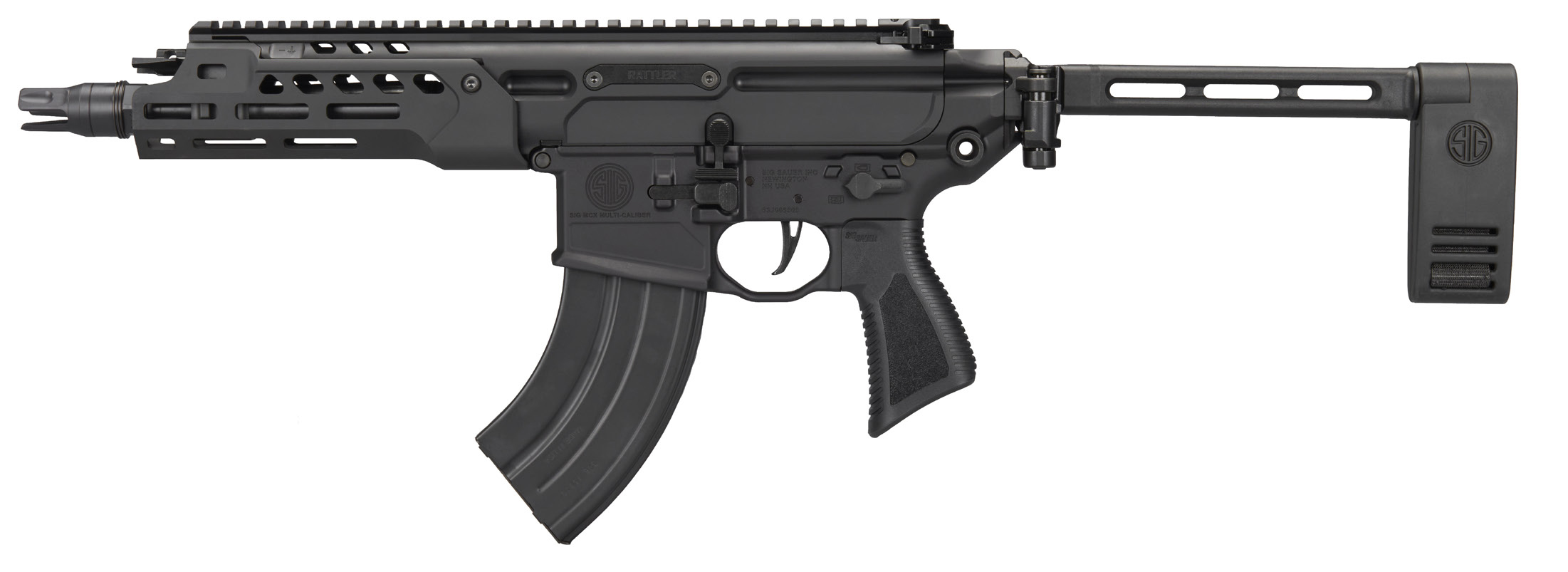 SIG Folding Pivoting Contour Brace – Cold Hammer Forged Barrel For Ultra Compact Design – Fullly Ambidextrous Controls – Interchangable Barrels Now Compatible with All LT Barrels and Handguards – SIG Flatblade Match Trigger – CALIBER 7.62X39 – FRAME MATERIAL ALUMINUM – FRAME FINISH BLACK ANODIZE – BARREL MATERIAL COLD HAMMER FORGED CARBON STEEL – BARREL FINISH MAG PHOSPHATE – MAGAZINE CAPACITY 28 ROUNDS – SIGHTS OPTIC READY – TRIGGER 2 STAGE MATCH ADJUSTABLE – OVERALL LENGTH 25.75 in – OVERALL HEIGHT 7.4 in – OVERALL WIDTH 2.25 in – BARREL LENGTH 7.75 in – BARREL TWIST 1:9.5 in – WEIGHT W/MAGAZINE 6.1 lb