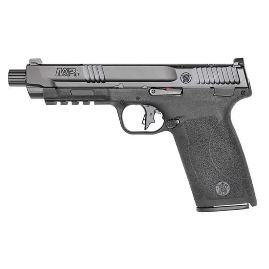 The New M&P 5.7 will light up the range and quicken your pulse. With its rotating 5 Tempo Barrel System the new M&P 5.7 utilizes the ballistics of the 5.7 x 28 round in tandem with the repeatability of the Tempo System. Get worry-free consistency in a 22+1 handgun. Take control and feel the fast. – Internal hammer-fired gas-operated locked-breech TEMPO barrel system (barrel doesn’t cam open until bullet passes gas port). – Slim optimally textured grip. – Ambidextrous slide stop and Manual Thumb Safety. – Reversible magazine release. – Slide cut for optics. – Flat-face trigger for consistent finger placement allows for more accurate and repeatable shooting. – Picatinny-style rail. – Forward slide serrations. – Crisp single-action trigger break. – Accurate 1 in 9 twist barrel. – Comes with two 22-round magazines. – Specs – CALIBER 5.7X28 – SIZE FULL – CAPACITY 22 – ACTION INTERNAL HAMMER FIRED – BARREL LENGTH 5 – GRIP POLYMER – SIGHTS WHITE DOT – OPTIC READY YES – SAFETY NO THUMB SAFETY – COLOR/FINISH BLACK – THREADED BARREL YES – FRAME POLYMER – NUMBER OF MAGAZINES 2 – BARREL MATERIAL STAINELESS STEEL