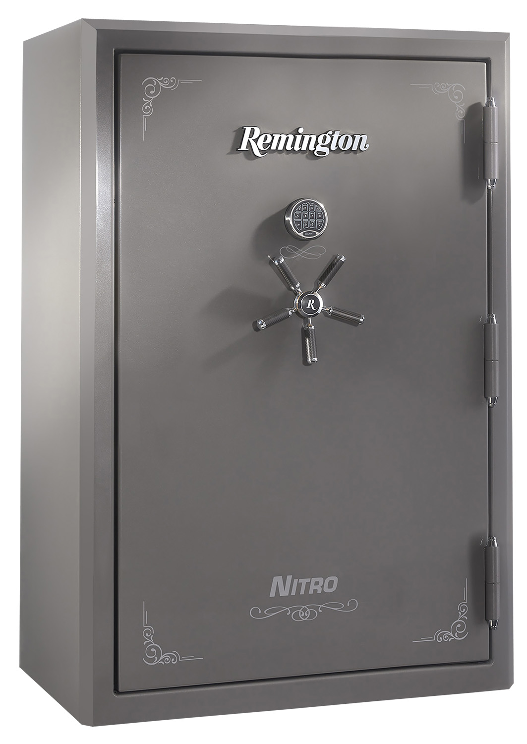 The Remington Nitro gun safe provides a secure place to store collections of firearms and valuables. The ultra-luxe exterior is painted a glossy Seltzer Gray Metallic and has a 5-spoke chrome wheel with carbon fiber accents. The interior is fully lit and features dual USB ports and dual outlets so you can stay charged. Adjustable shelving and barrel racks allow for customization. The interior is detailed with quilted vinyl on the sidewalls, door, and edges of the shelving.