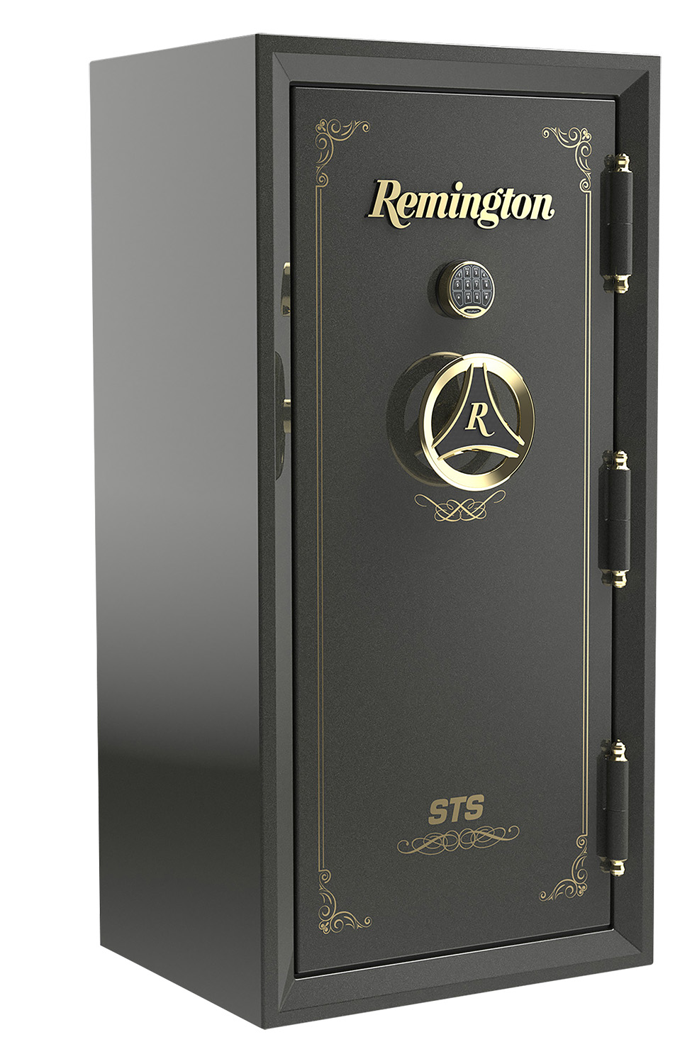The Remington STS, built from 10-gauge steel. This waterproof and fireproof safe can withstand 120 minutes at 1800 and water resistance for 2 feet for up to 7-days. The UL-rated SecuRam lock is backlit and the interior is fully lit for easy access in low light conditions. Available in a metallic Sage STS Green, the safe stands out with brass hardware and a brass Remington script decal on the front. The Remington STS gun safe represents the premier level of everything; security, performance, durability, and luxury. 30 long guns + 6 handguns + 1 long gun on the door