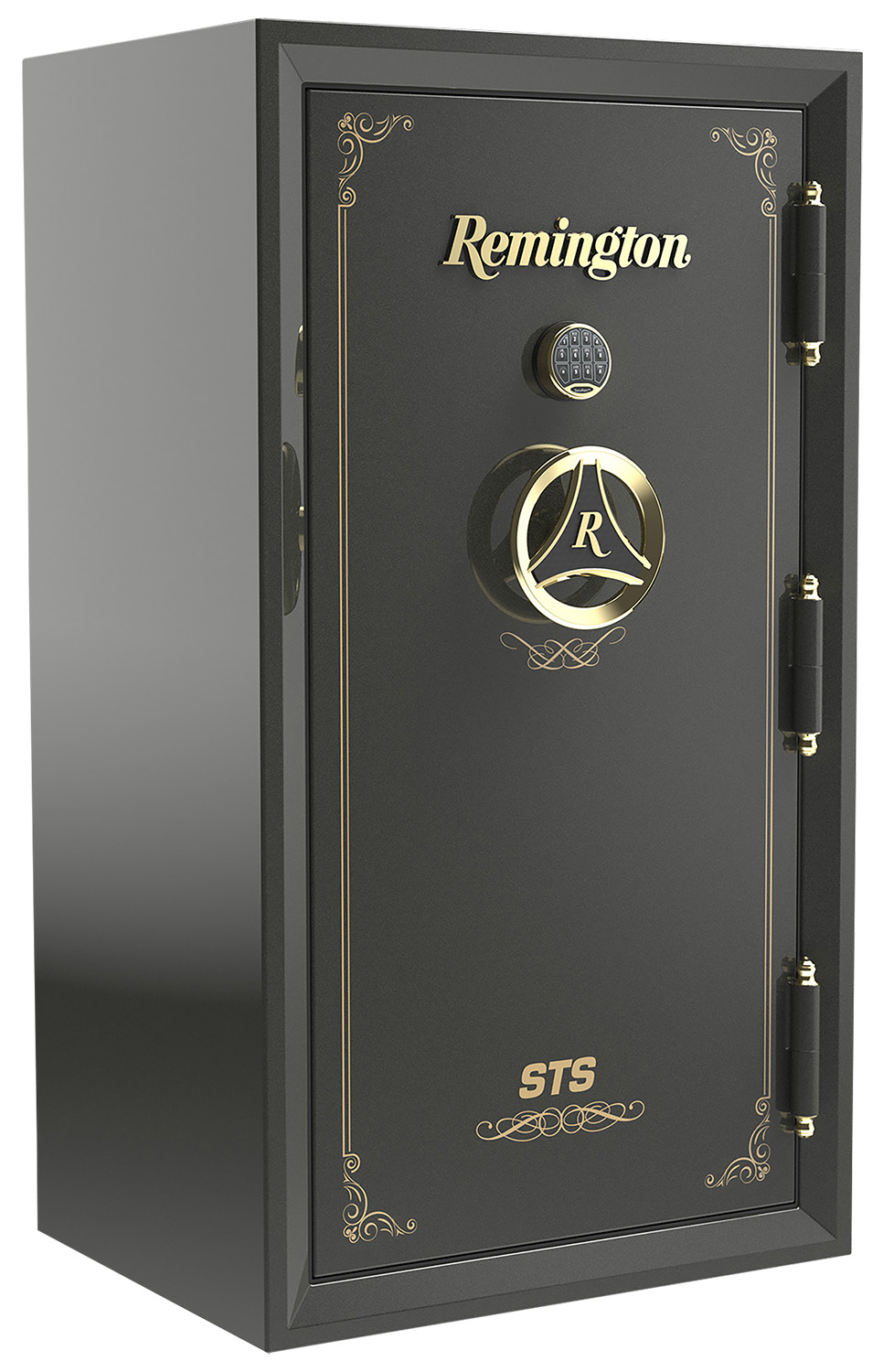 The Remington STS, built from 10-gauge steel. This waterproof and fireproof safe can withstand 120 minutes at 1800 and water resistance for 2 feet for up to 7-days. The UL-rated SecuRam lock is backlit and the interior is fully lit for easy access in low light conditions. Available in a metallic Sage STS Green, the safe stands out with brass hardware and a brass Remington script decal on the front. Its also functional with interior shelving. 40 long guns + 6 handguns + 1 long gun on the door