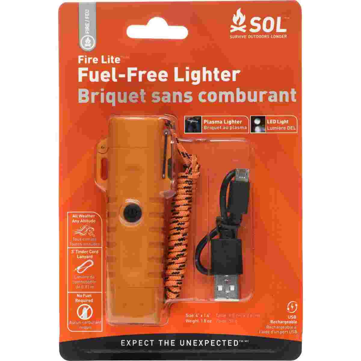 The Fire Lite Fuel-Free Lighter lets you start fires with the touch of a button. This weatherproof electric lighter works in any condition at any altitude. Weighing less than 2 oz. the plasma lighter comes with a built-in LED light and tinder paracord lanyard that can be used as tinder or rope. The lighter's top-facing dual arcs ignite anything flammable on contact ideal for lighting campfires stoves and more. USB-rechargeable this lighter has you covered for easy awesome fire starting; a single charge powers about 45 lighter uses or 3 hours of low light.