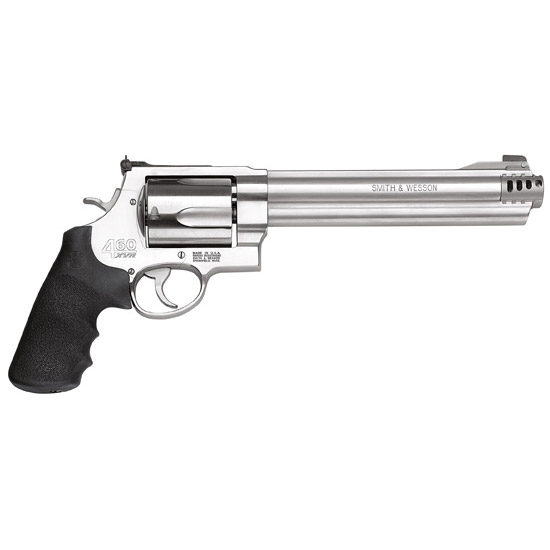 Action: SA/DA – Caliber: .460 S&W Magnum® – Capacity: 5 – Finish: Stainless – Material: Steel – Grips: Synthetic – Sights: HI-VIZ® Interchangable / Adjustable Black Blade – Barrel Length: 8.38 – Overall Length: 15 – Weight: 72.5 oz – Removable Interchangeable Compensator – The Highest Velocity Revolver in the World – 2330 FPS/200 Grain! – The Most Powerful .45 Caliber Revolver In the World – 2400 lbs/ft! – If You Zero its Sights at 200 Yards You Will Bag Your Buck with a Center Hold 0-250 Yards with No Hold Over! Just Center It and Fire. The 460XVR Will Do The Rest – Gain Twist Rifled Barrel for Superb Accuracy – Lighter Loads That The 460 Will Also Fire Include .45 Colt and .454 Casull – Incredibly Low Perceived Recoil For All Loads – We all grew up hearing the phrase Faster than a speeding bullet… but not when it is fired from Smith & Wesson’s new Model 460XVR with the highest muzzle velocity of any production revolver on earth. The Model 460XVR is so revolutionary that it required an entirely new designation…XVR X-treme Velocity Revolver. Starting with their Extra Large Frame the Smith & Wesson engineers worked to deliver maximum velocity – over 2300 feet per second – to reach the target faster than ever before. The 460XVR has interchangeable compensators to accommodate every load and its gain-twist rifled barrel means superb long-range accuracy (beyond 200 yards) with every shot! Only Smith & Wesson could deliver this much power this much velocity and this much accuracy in a precision production revolver.