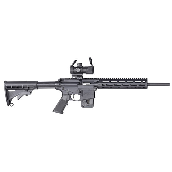 Caliber: 22 LR – Action: Semi Auto Blow Back – Capacity: 10 Rounds – Barrel Length: 16.5 Threaded (41.9 cm) – Overall Length: 33.8 (85.9 cm) Extended – Weight: 79.3 oz. – Grip: Polymer – Stock: Fixed – Barrel Material: Carbon Steel – Upper & Lower Receiver Material: Polymer – Finish: Matte Black – Features: – 10 M&P® Slim Handguard with Magpul® M-LOK® – 2 M-LOK® Rail Panel Included – Functioning Charging Handle – 2-Position Receiver Mounted Safety – Model: MP-100 – Reticle: Variable Intensity 4.0 MOA Round Dot – Reticle Color: Red or Green – Adj Click Value: 1/4 MOA @ 100 Yards – Eye Relief: Unlimited – Battery Type: CR1620 (1 Battery) – FEATURES: – Compatible with most M1913 Picatinny Rails – Adjustable for Windage and Elevation – Flip-Open Lens Caps – One-Piece Tube Construction – Black Finish