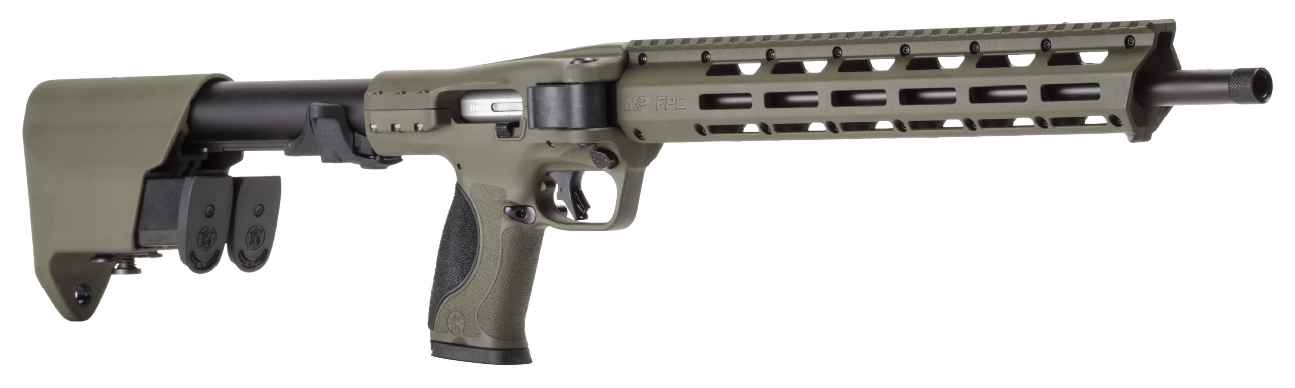 Smith & Wesson’s M&P FPC features a slim and compact design that allows it to be stowed away and accessible when needed. Inspired by our M&P handguns the M&P FPC has a familiar grip and trigger is compatible with 10MM M&P® pistol magazines has the ability to store additional magazines with its in-stock storage and features M-LOK slots in the forend to mount accessories. – Compact Folding Design- With the ability to fold from the side the M&P FPC allows you to get a small overall package and ensures that mounted optics aren’t disturbed. – In-Stock Magazine Storage- Slots in the stock allow you to store two M&P 10MM magazines. – Familiar Ergonomics- The same grip and trigger that can be found on our M&P pistols give you a familiar experience that youve come to appreciate from our firearms. – 16.25 9/16×24 threaded barrel w/thread protector. – M-LOK® slots on handguard with Picatinny-style rail on top. – Charging slide/handle doubles as retainer when folded. – Compact side-folding design. – 30 5/8 unfolded length to 16 1/2 folded – Flat-face trigger with crisp break. – Reversible magazine catch. – Fixed 14.6 LOP polymer stock. – In-stock magazine storage w/quick-release tab system. – Ships with three magazines (3) 15-round magazines. – Ships with (four) interchangeable palmswell grip inserts. – width 2.5 in – length 30.6 in – height 8 in – weight 91.2 oz – CALIBER 10MM – SIZE RIFLE – CAPACITY 15 – ACTIONBLOW BACK – BARREL LENGTH 16.25 – GRIP POLYMER – SIGHTS NONE – OPTIC READY YES – SAFETY CROSS-BOLT – COLOR/FINISH OD GREEN – STATE COMPLIANCE CO – THREADED BARREL YES – BARREL MATERIAL 4140 CM – FRAME ALUMINUM – NUMBER OF MAGAZINES 3 – STOCK FPC – MODEL FPC