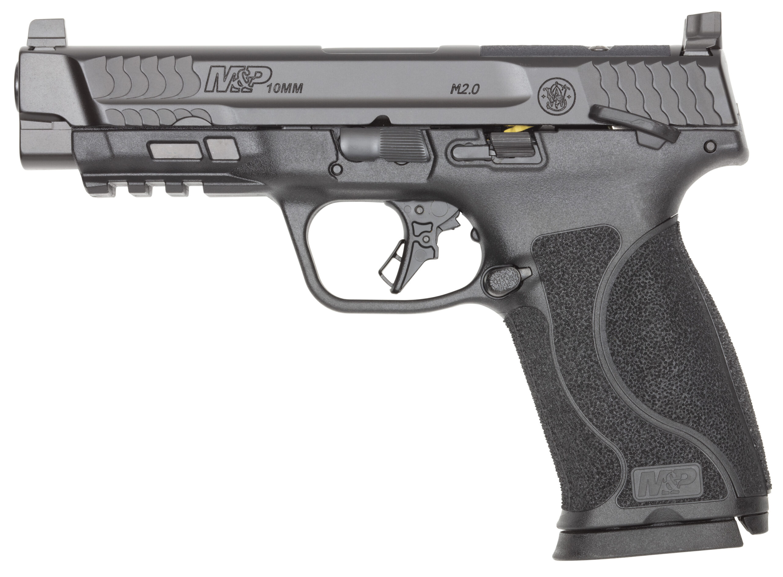 Our commitment to excellence shines through our M&P® family of polymer-frame pistols renowned for their reliability and performance. As the landscape continued to shift we rose to the challenge developing cutting-edge polymer-frame striker-fired pistols that have become top sellers in the industry. Chambered in 10MM features like a reversible magazine release flat-face trigger for more accurate and repeatable shooting and a slide cut for optics make this handgun a perfect option for those looking to step up their game. – ADAPTABLE GRIP- Four interchangeable palmswell grip inserts included to tailor the pistol for optimal hand fit and trigger reach- S M ML L. – FLAT-FACE TRIGGER- For consistent trigger finger placement that allows for more accurate and repeatable shooting. – OPTIC-READY SLIDE- The ability to mount most red dots on the market with the Smith & Wesson C.O.R.E. system. – 4.6 1:10 twist stainless steel barrel w/Armornite® finish. – Optic ready C.O.R.E. System. – Flat-face trigger. – 18 degree grip angle. – Optic-height white dot sights. – Manual Thumb Safety. – Stainless steel slide w/Armornite® finish. – Four interchangeable palmswell grip inserts. – Ships with two 10-round magazines. – width 1.3 in – length 7.9 in – height 5.6 in – weight 29.6 oz – CALIBER 10MM – SIZE FULL – CAPACITY 10 – ACTION STRIKER FIRED – BARREL LENGTH 4.6 – GRIP POLYMER – SIGHTS OPTIC-HEIGHT WHITE DOT – OPTIC READY YES – SAFETY THUMB SAFETY – COLOR/FINISH BLACK – STATE COMPLIANCE CO CT DE HI IL MD NJ NY RI VT WA DC – BARREL MATERIAL STAINLESS STEEL – FRAME POLYMER – NUMBER OF MAGAZINES 2 – MODEL M&P 2.0