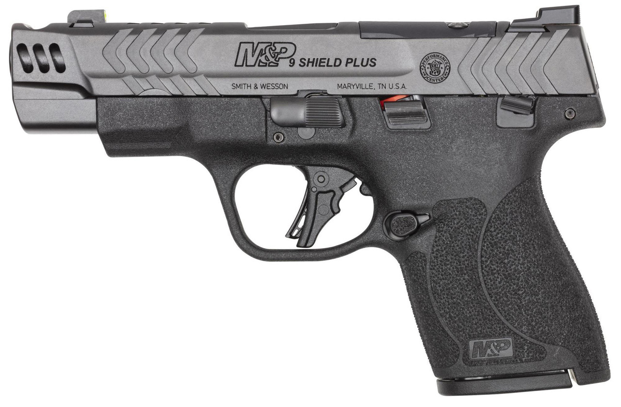 Continuing to pursue excellence and performance the new Performance Center M&P9 Shield Plus Carry Comp pistol focuses on enhancing the shooting experience. Strategically designed to leverage the gasses escaping the end of the gun during firing the Carry Comp helps reduce felt recoil meaning you can stay on target better. The perfect bridge between big gun performance in a small carry pistol. – CLEAR SIGHT CUT- Our unique design diverts gasses away from your optic letting you maintain an unobstructed view when firing. – FLAT-FACE TRIGGER- Our flat trigger design allows for consistent trigger finger placement giving you more accurate and repeatable shooting. – CARRY COMP®- Our strategically designed Power Port diverts gas upwards to reduce felt recoil when firing. – 4 1:10 twist stainless steel barrel w/Armornite® finish. – Optic ready. – Flat-face trigger with PC tuned action. – 18 degree grip angle. – Blacked-out serrated rear sight night sight front sight. – Stainless steel slide ported w/ gray Armornite® finish. – Ships with two 10-round magazines. – width 1.1 in – length 7 in – height 4.6 in – weight 21.8 oz – CALIBER 9MM – SIZE MICRO-COMPACT – CAPACITY 10 – ACTION STRIKER FIRED – BARREL LENGTH 4 – GRIP POLYMER – SIGHTS NIGHT SIGHTS – OPTIC READY YES – SAFETY THUMB SAFETY – COLOR/FINISH BLACK – STATE COMPLIANCE CO CT DE HI IL MD NJ NY RI VT WA DC – THREADED BARREL NO – BARREL MATERIAL STAINLESS STEEL – FRAME POLYMER – NUMBER OF MAGAZINES 2 – 10LB TRIGGER NO – MODEL SHEILD PLUS